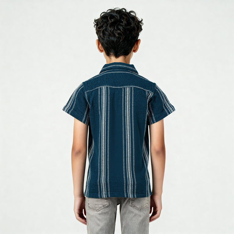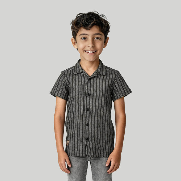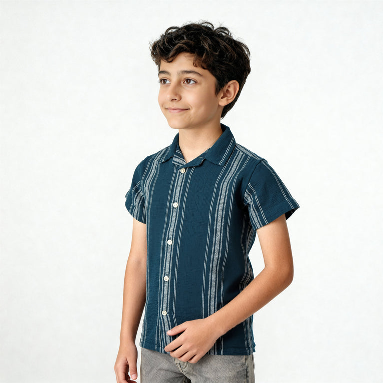 Experience the perfect blend of comfort and style with our Boys Striped Camp Collar Retreat Half Sleeve Shirt. Crafted from 100% cotton, this shirt ensures breathability and softness, making it ideal for all-day wear. The classic striped pattern and camp collar add a touch of sophistication, perfect for both casual outings and special occasions.