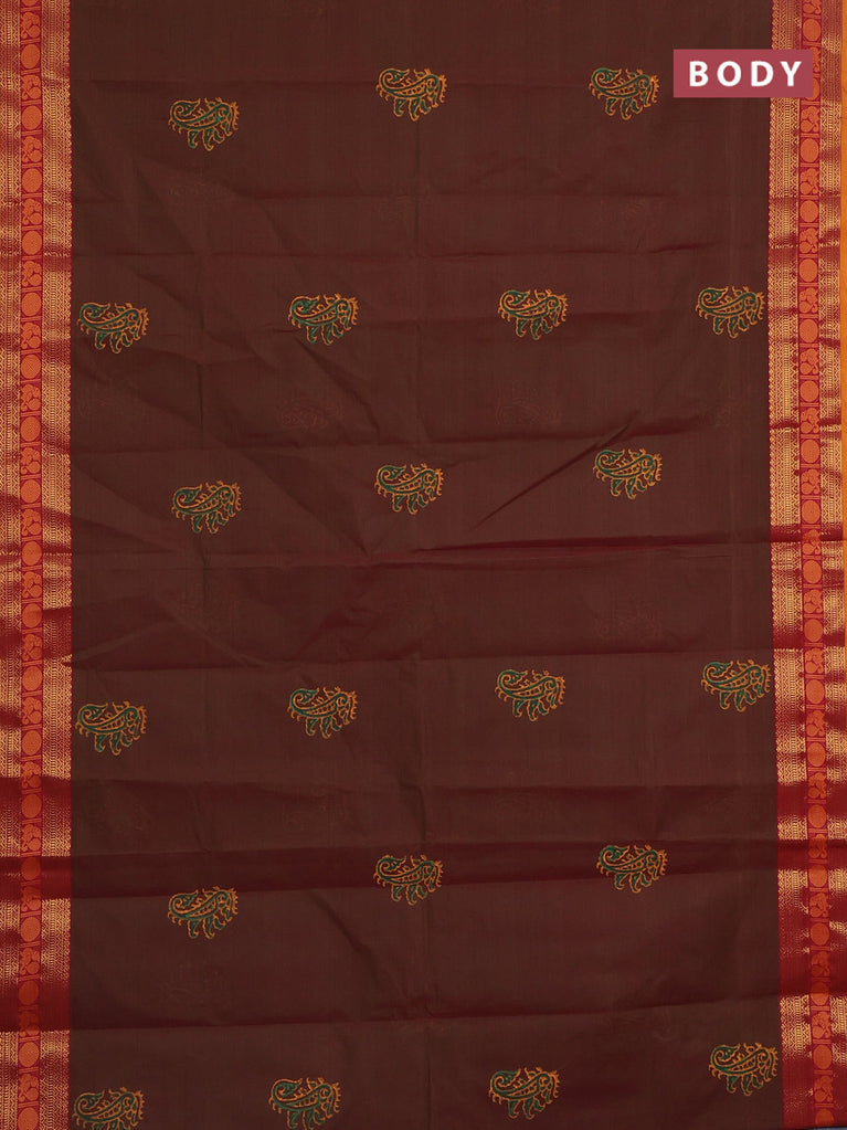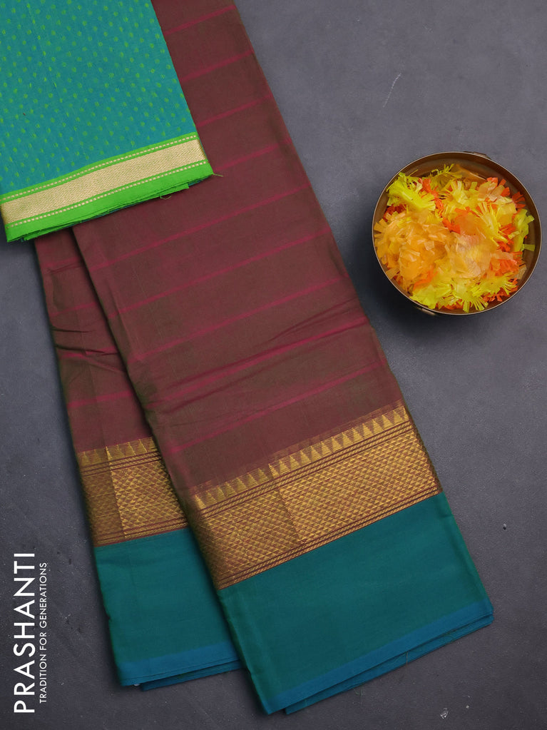Chettinad cotton saree green and brown with thread woven buttas and rattapet zari woven border