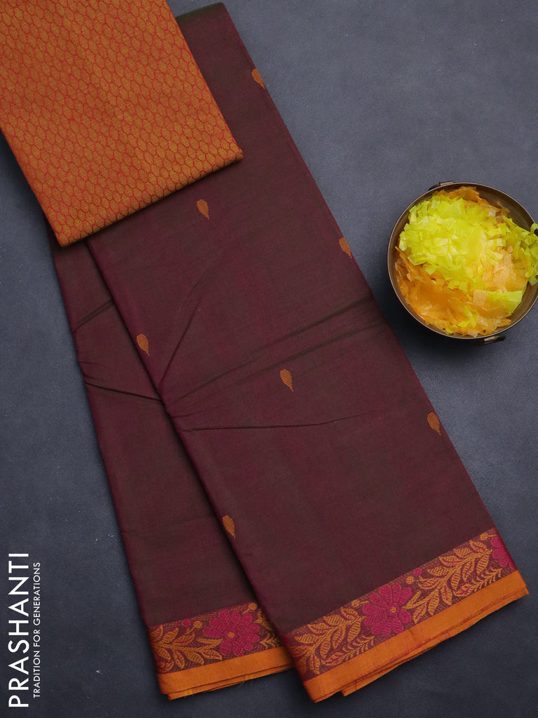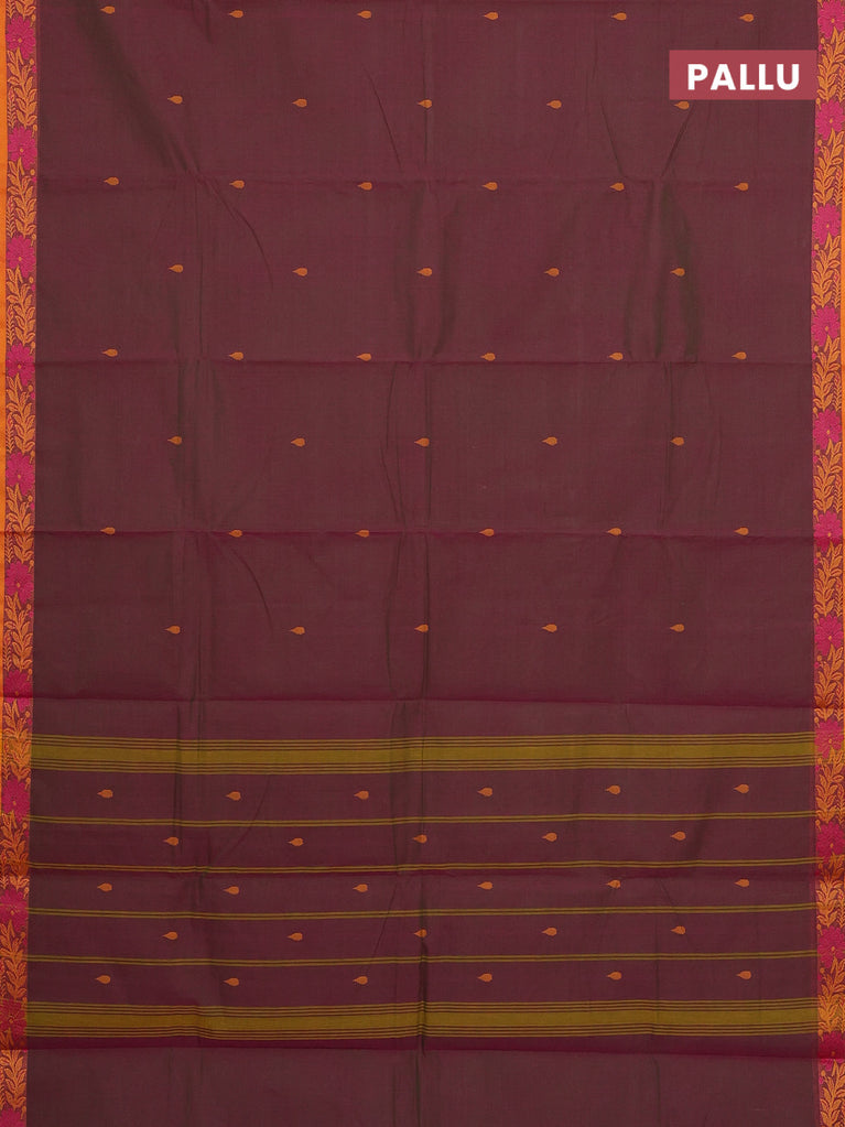Chettinad cotton saree dual shade of greenish maroon and dark mustard with butta prints and zari woven border