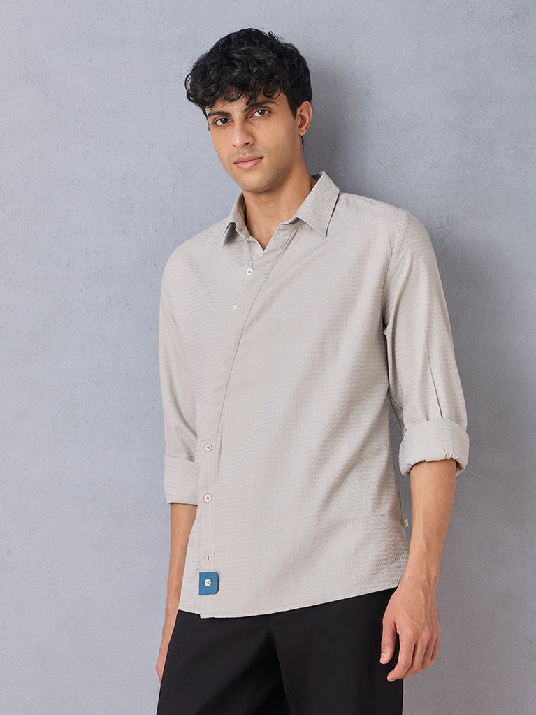 This light grey shirt is an easy staple for the season, designed with a chevron textured weave that adds gentle depth to the fabric. The asymmetric placket brings in a modern touch that stays understated, and side pockets offer everyday practicality without interrupting the clean lines. A small blue tab at the hem adds a quiet hint of colour. With a crisp collar and a shape that works well buttoned up or worn open over a tee, it slips easily into daily routines and different moods.