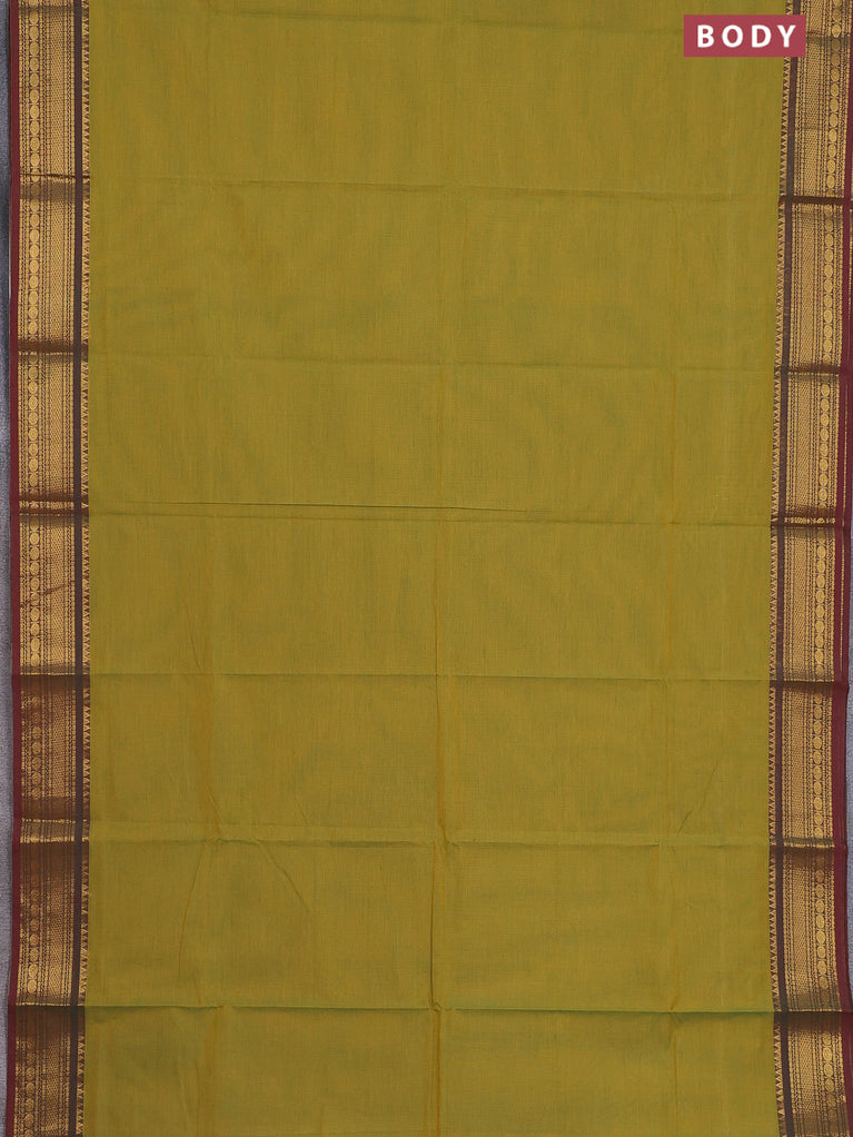 Chettinad cotton saree yellowish green and maroon with thread woven buttas and zari woven border