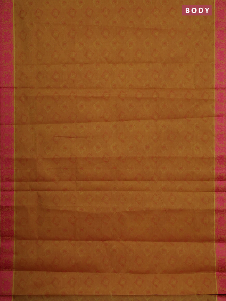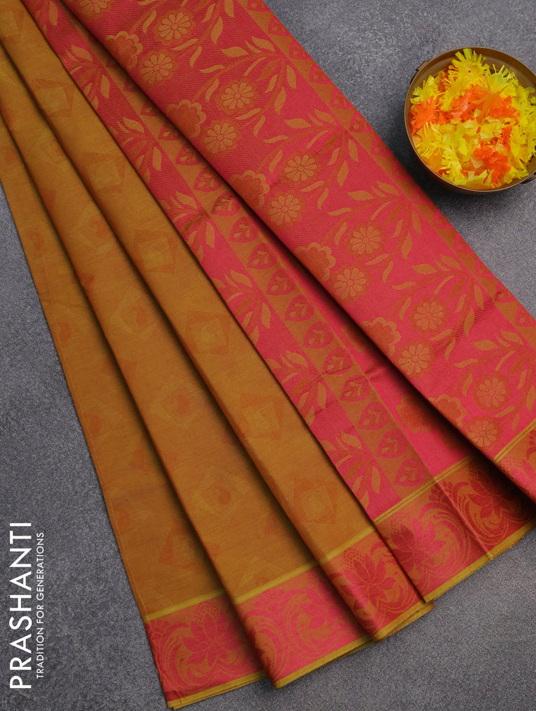 Coimbatore cotton saree dual shade of dark mustard and pink with allover self emboss and thread woven border