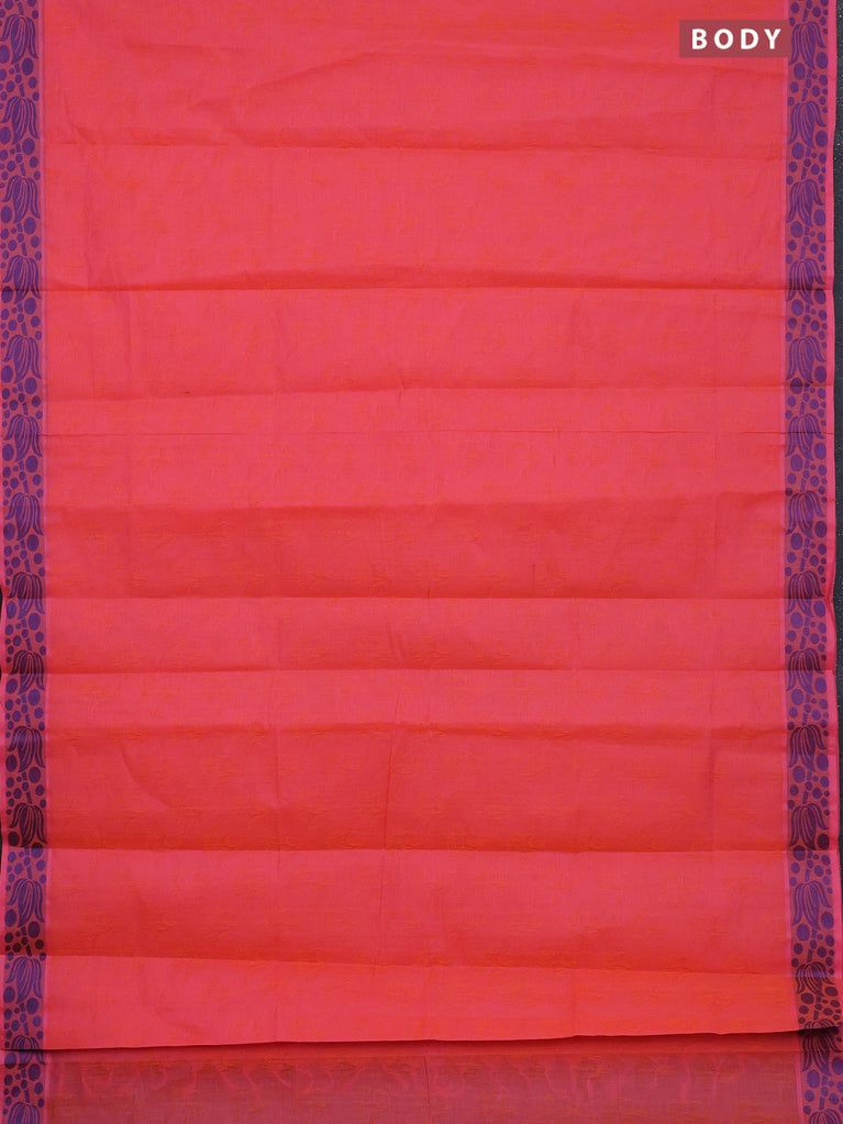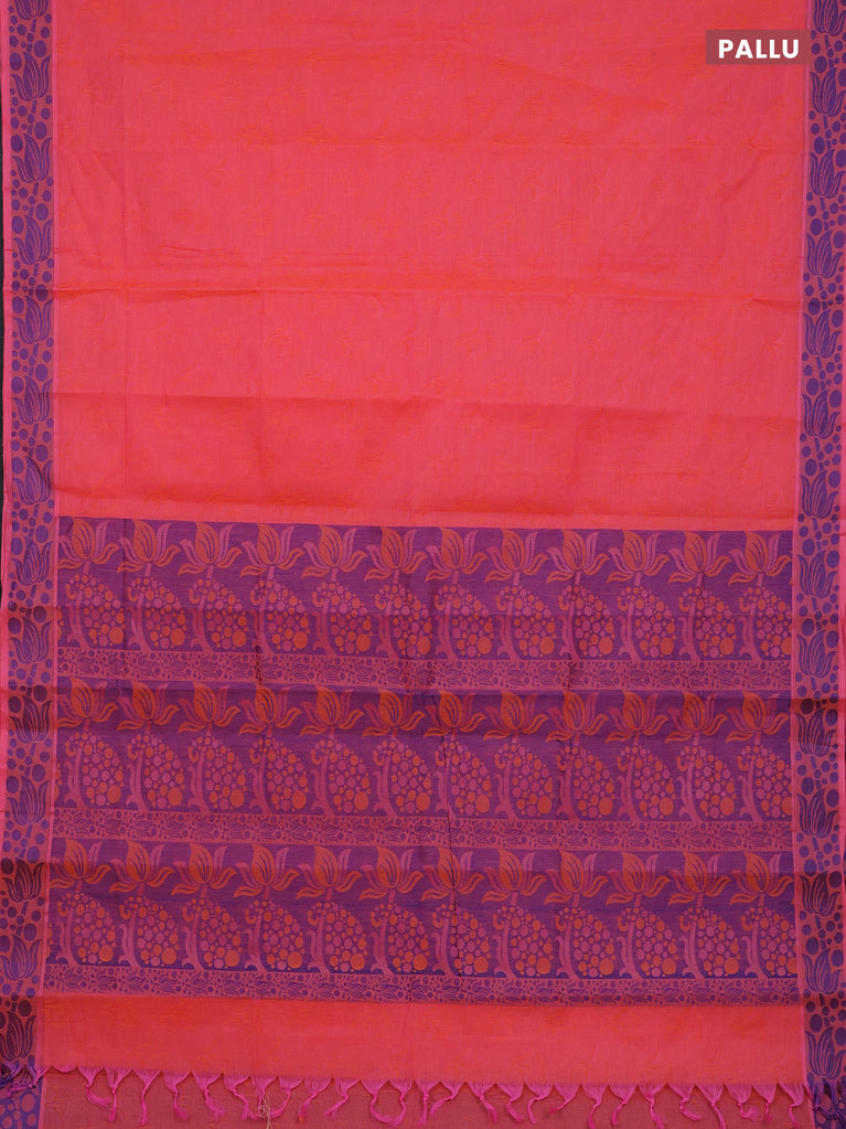 Coimbatore cotton saree dual shade of pinkish orange and blue with allover self emboss and thread woven border