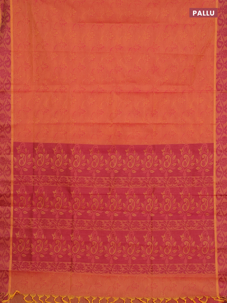 Coimbatore cotton saree dual shade of mustard yellow and pink with allover self emboss and thread woven border
