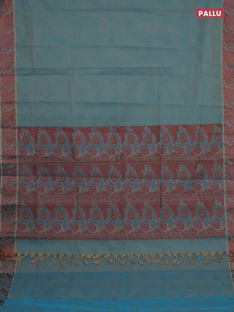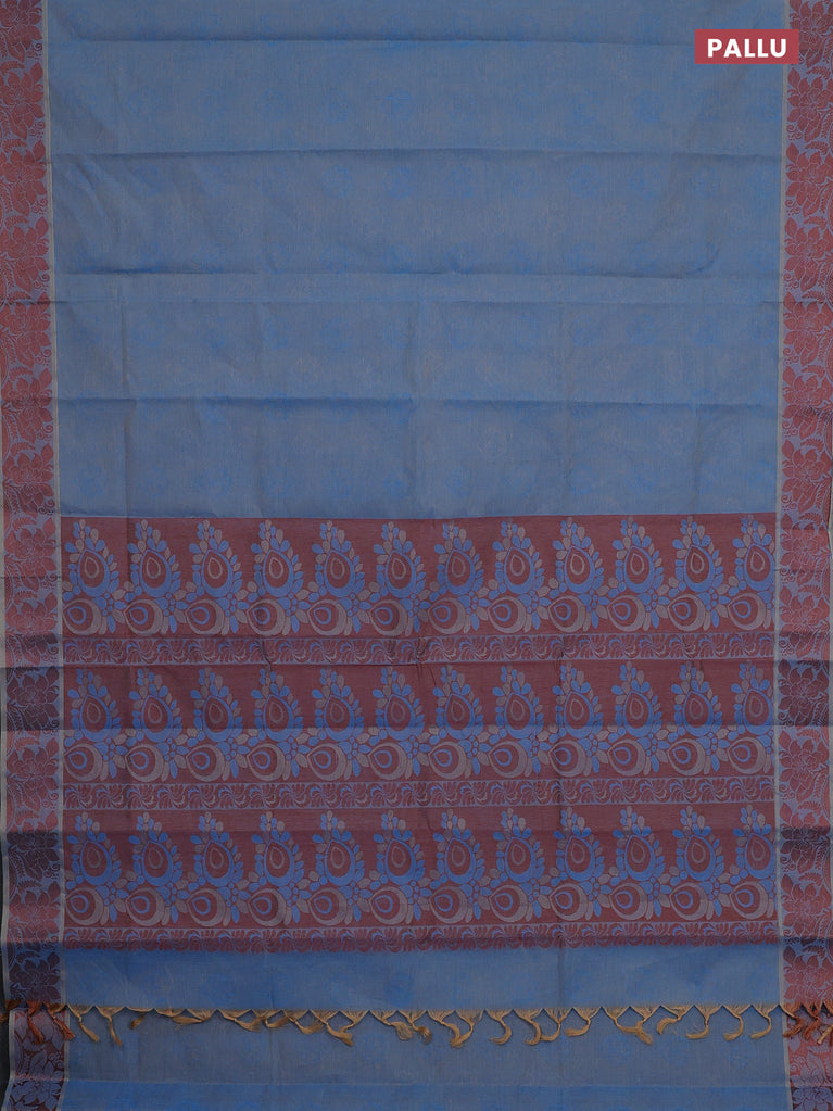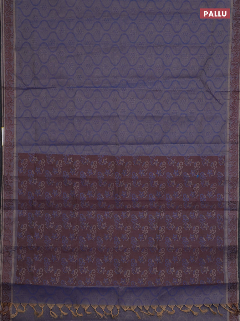 Coimbatore cotton saree dual shade of blue and coffee brown with allover self emboss and thread woven border