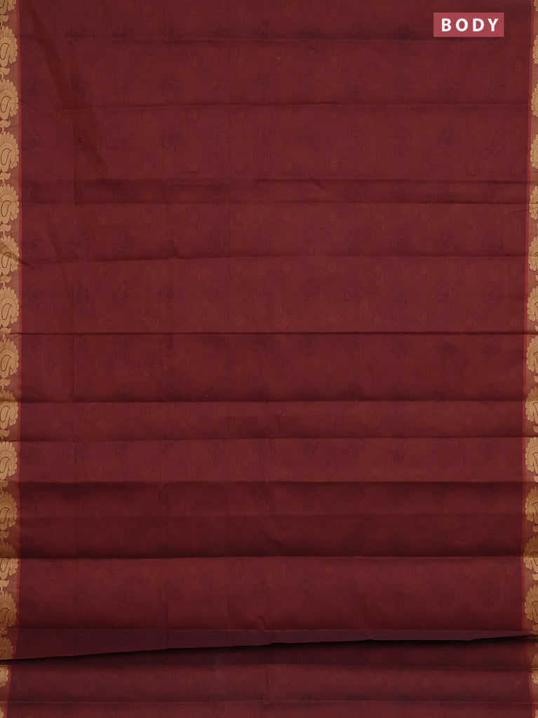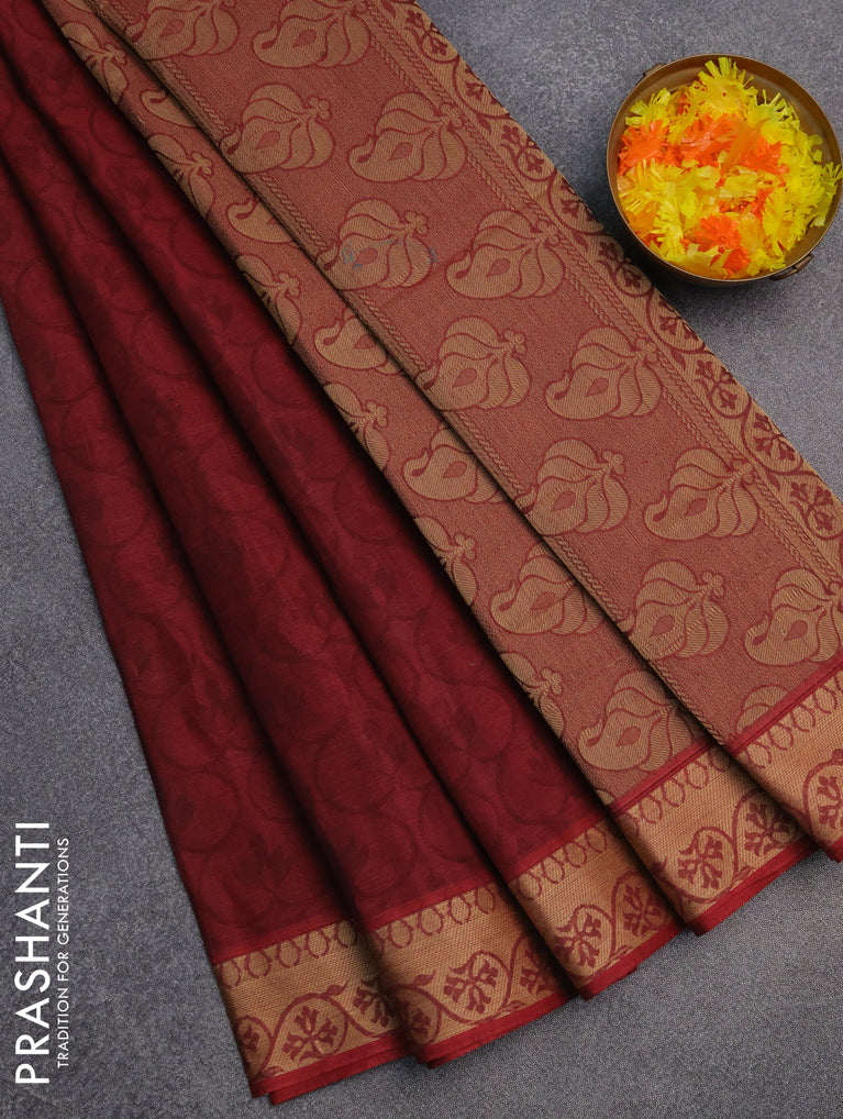 Coimbatore cotton saree deep maroon and sandal with allover self emboss and thread woven border
