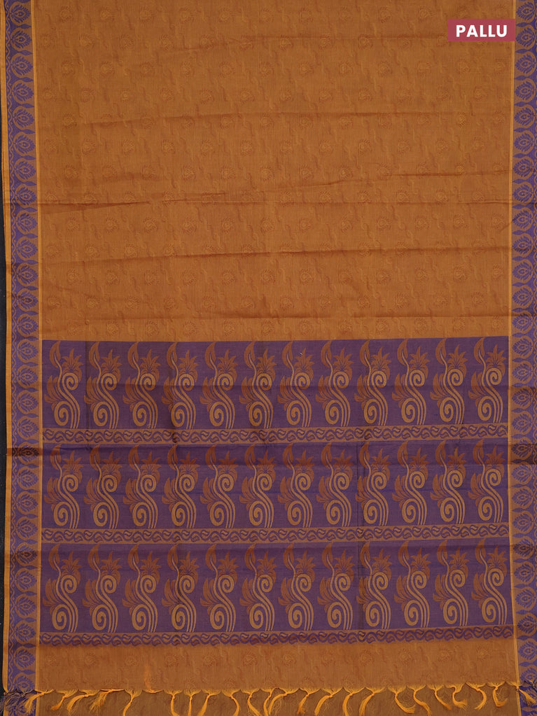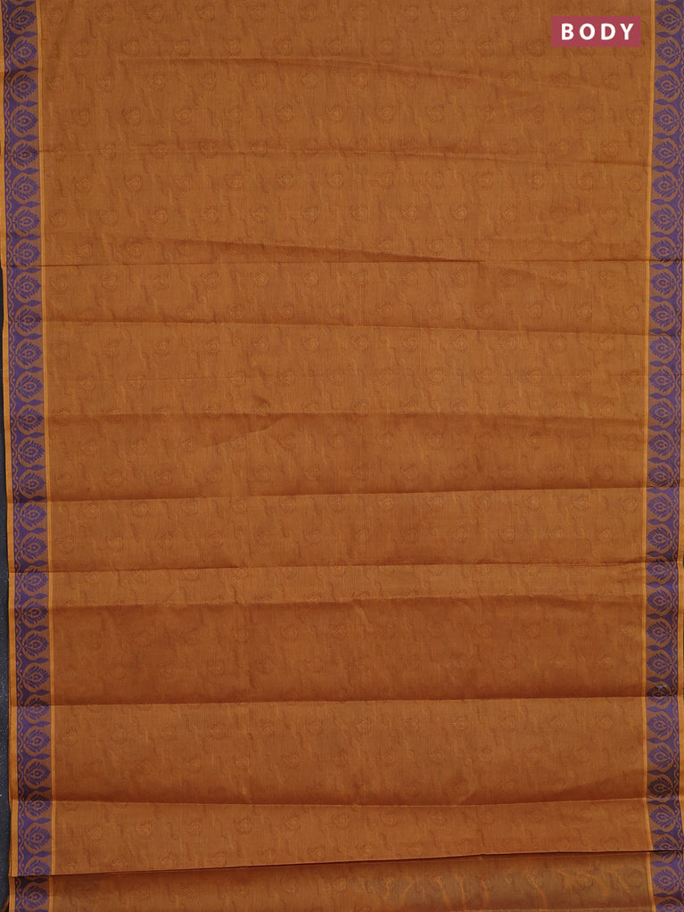 Coimbatore cotton saree dark mustard and blue with allover self emboss and thread woven border