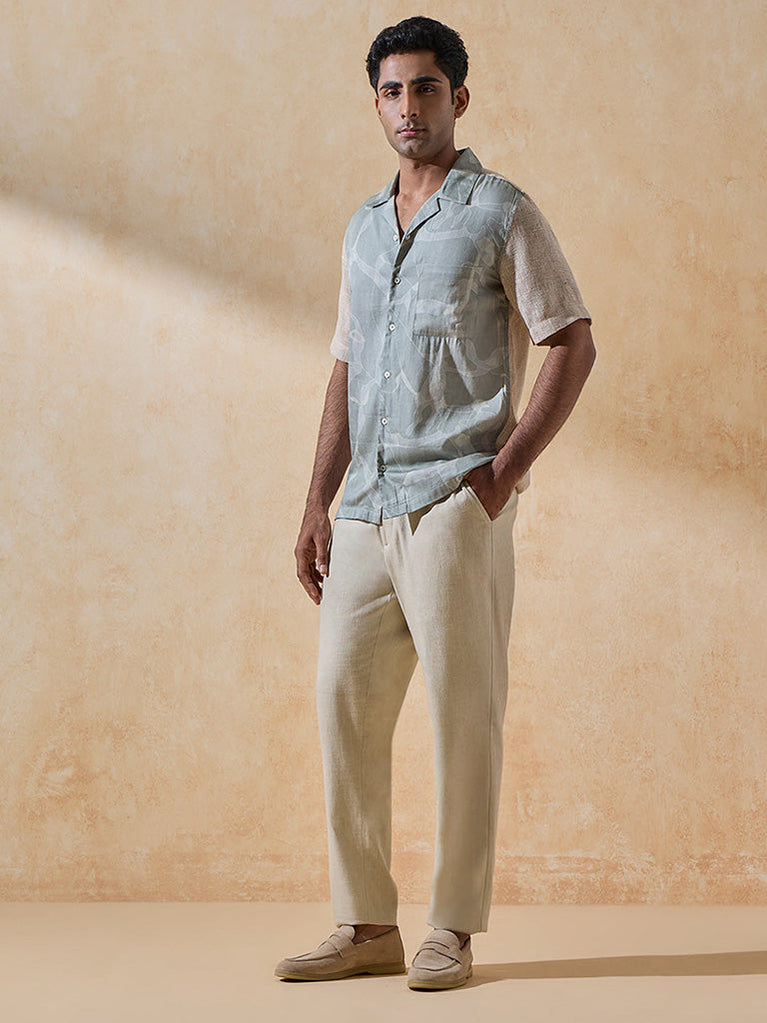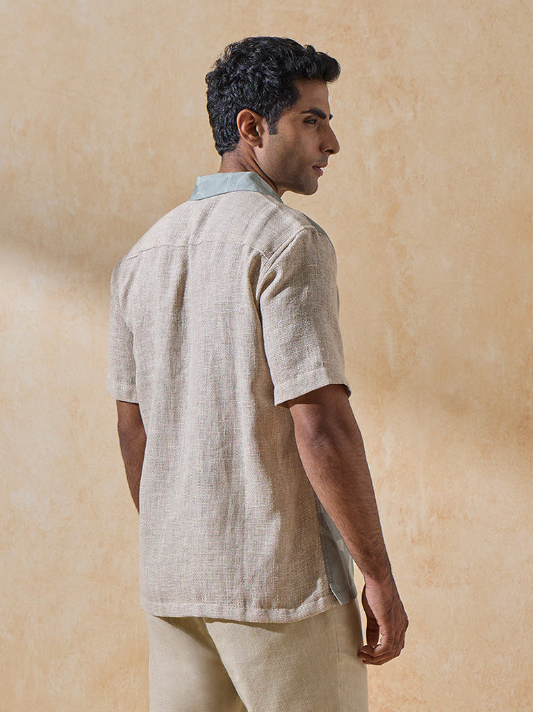 Playful in spirit yet modern in design, this blue shirt reimagines festive dressing with a contemporary twist. A dusty blue body offset by textured sleeves creates a bold color-block effect, while a notched collar and short sleeves keep the silhouette relaxed and easy. Designed for celebrations that spill from day to night, it’s perfect for those who like their festive looks to feel current, confident, and refreshingly effortless.