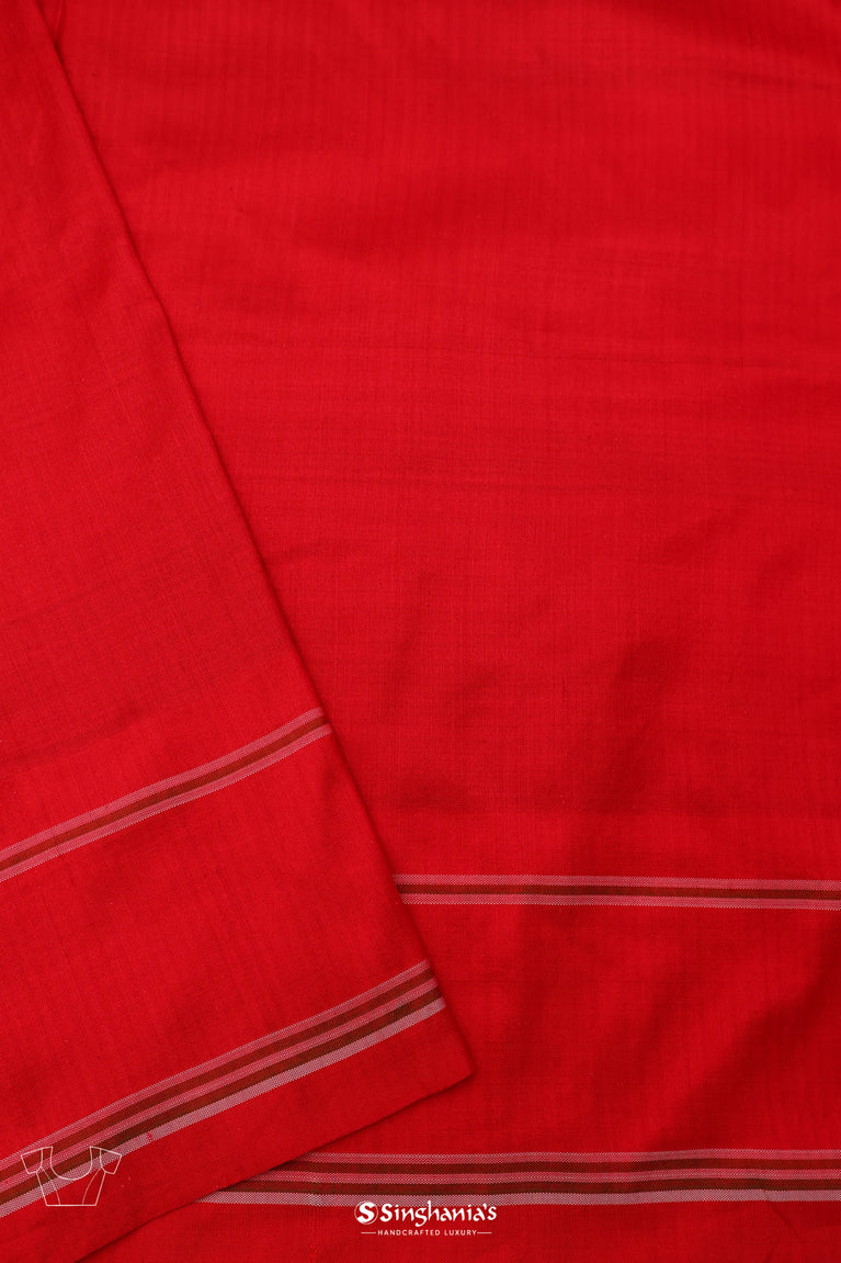 A dark black cotton saree decorated with white and red ikkat pattern in checks weaving all over. The contrast red small border and the pallu feature white floral-geometrical pattern on solid colour, accentuating the whole look.