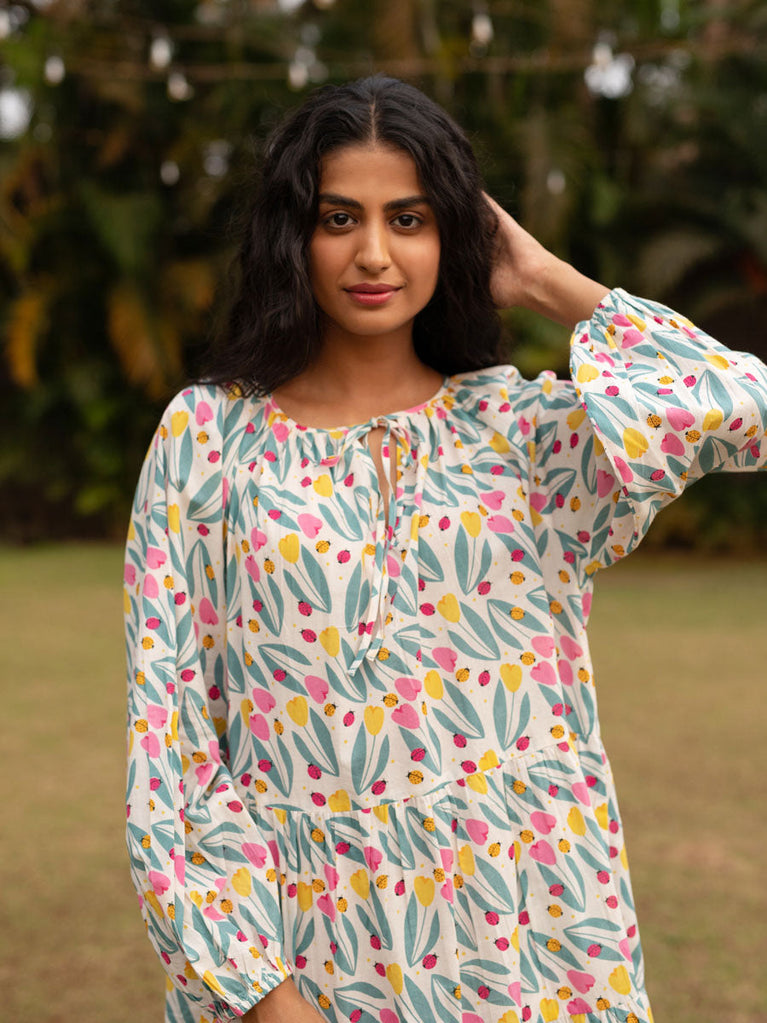 Blouse: Su, the model is wearing size XS of the blouse called Desi pop
