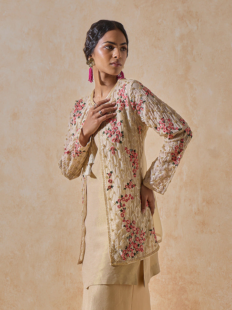 Enhance your ethnic semblance with a chic layering option, like this kurta. Thoughtfully crafted with a mix of Geometric patterned sequins, vivid floral embroidery and delicate beadwork along the placket and collar, this separate comes finished with full length sleeves and a tie-up feature with tassels for added style.
