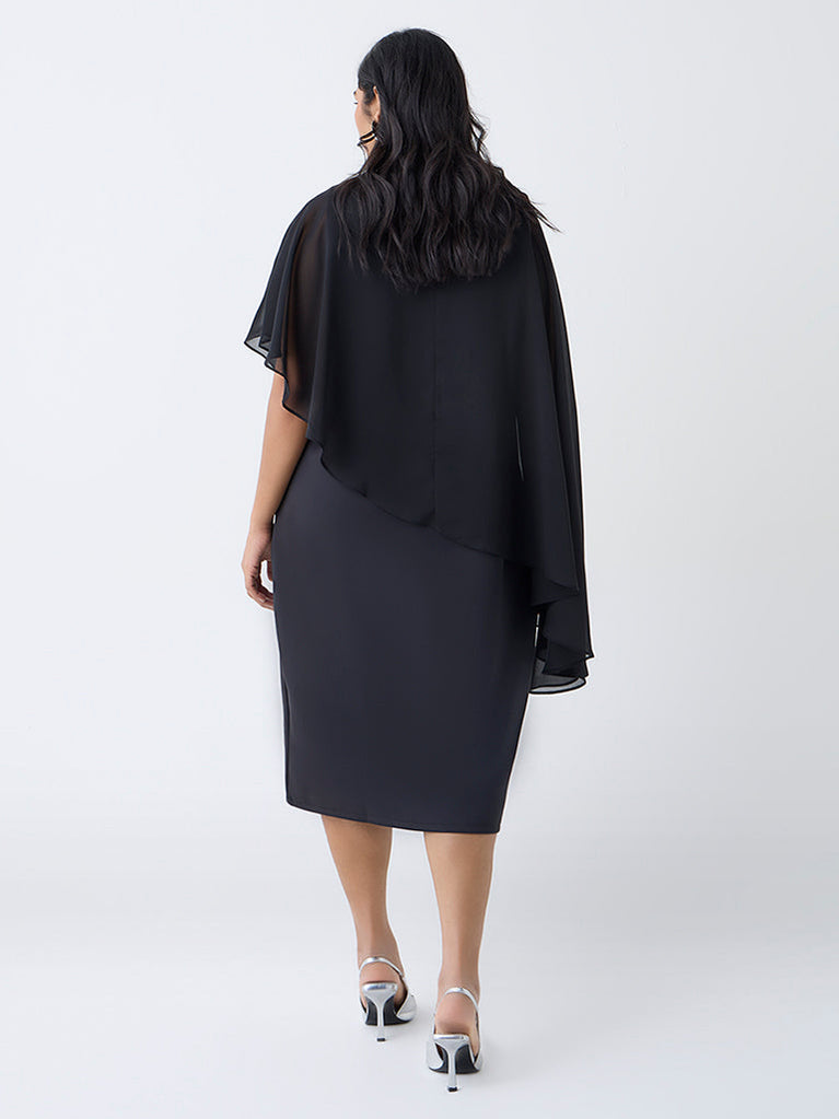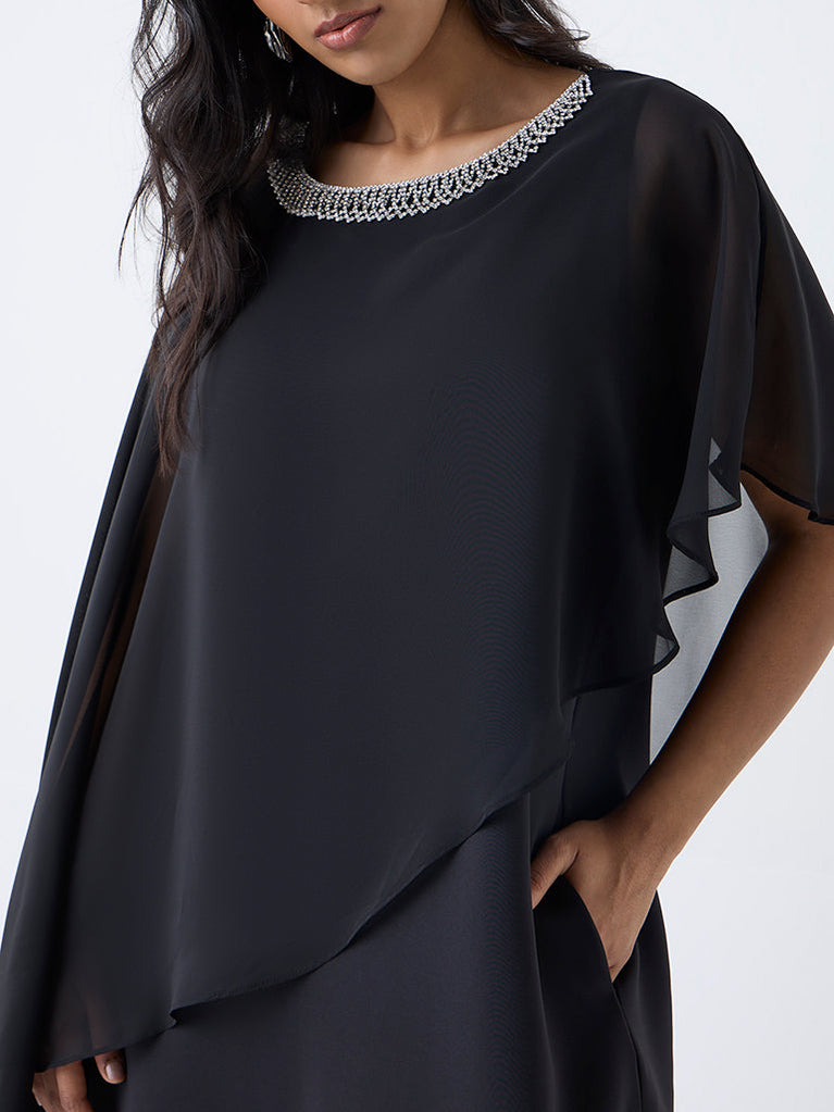 Gia redefines evening elegance with this black dress, designed in a flattering A-line silhouette. Featuring a sheer mesh overlay and asymmetrical sleeves, it creates a sense of layered movement. The round neckline is embellished for a touch of sparkle, while the high-quality fabric and functional side pockets ensure both comfort and sophistication.