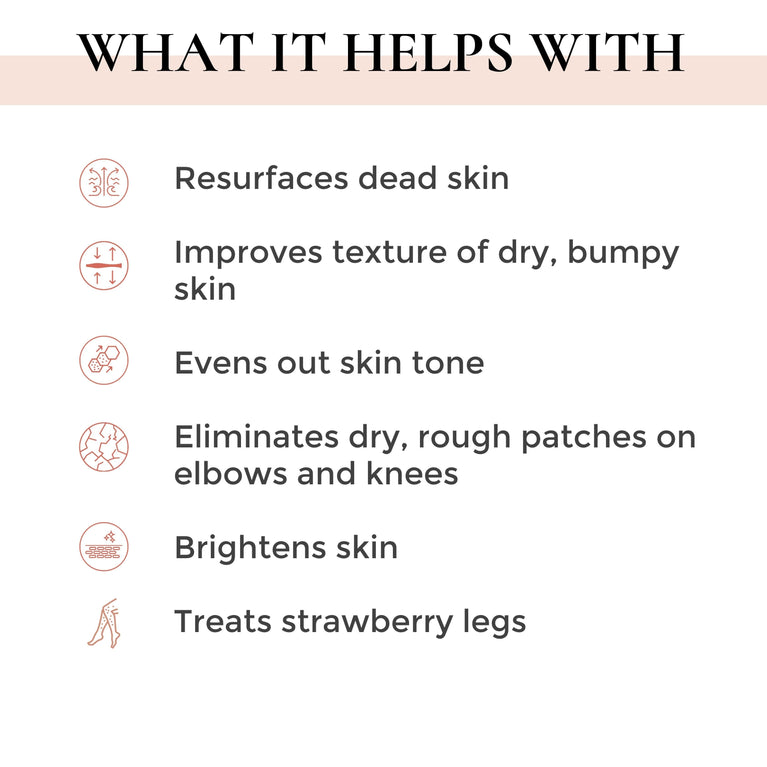 ✔ Helps bumpy skin ( keratosis pilaris or chicken skin)✔ Improves skin texture✔ Exfoliates gently✔ Moisturizing✔ Brightens skin tone✔ Eliminates rough patches on elbows & knees✔ Reduces In-grown hair✔ Lightweight, non-greasy formula