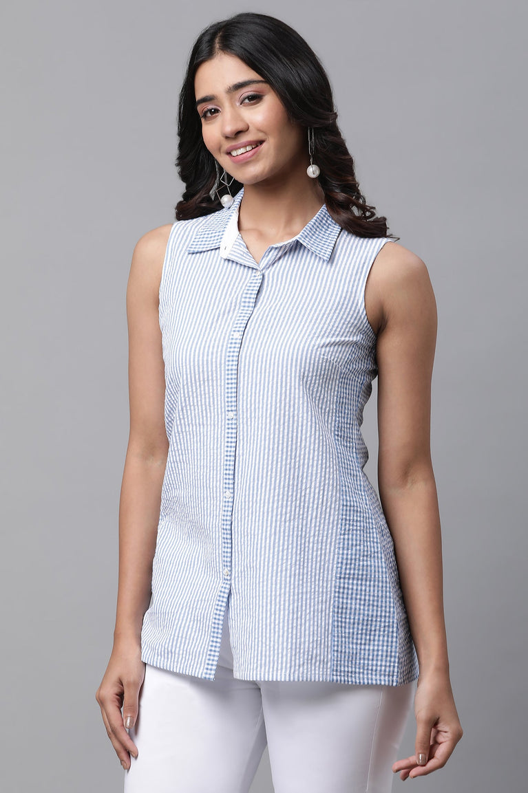Accentuate your everyday look with this textured seer sucker fabric short kurti. It has been elevated with checks play on side panel which gives this a very fresh look. This Aurelia top-wear is highlighted with shirt collor and sleeveless style.
