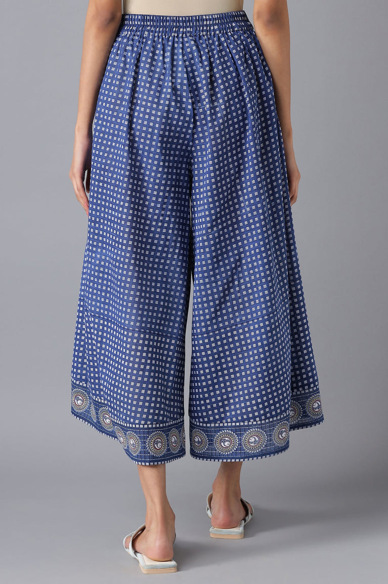 Blue coloured a-line culottes with floral print detail and a partially elasticated waistband.