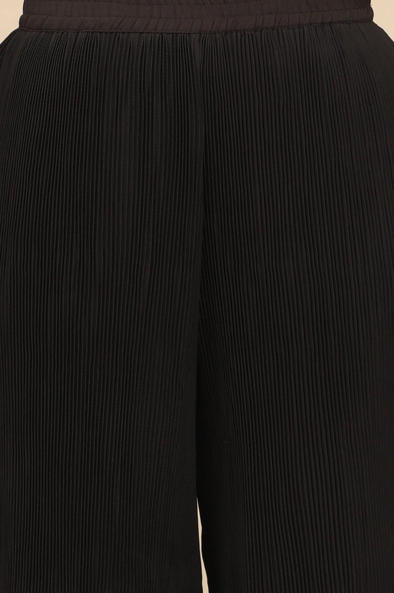 The partially elasticized yarn dyed shiny twill narrow palazzo is a versatile and stylish addition to any wardrobe. The partial elasticization at waist provides a comfortable and adjustable fit. The narrow fit gives a modern and trendy look, while the shiny twill fabric adds a touch of elegance and sophistication. It is designed to give a casual and festive look, making it a perfect option for a range of occasions, from casual daytime outings to more festive events.