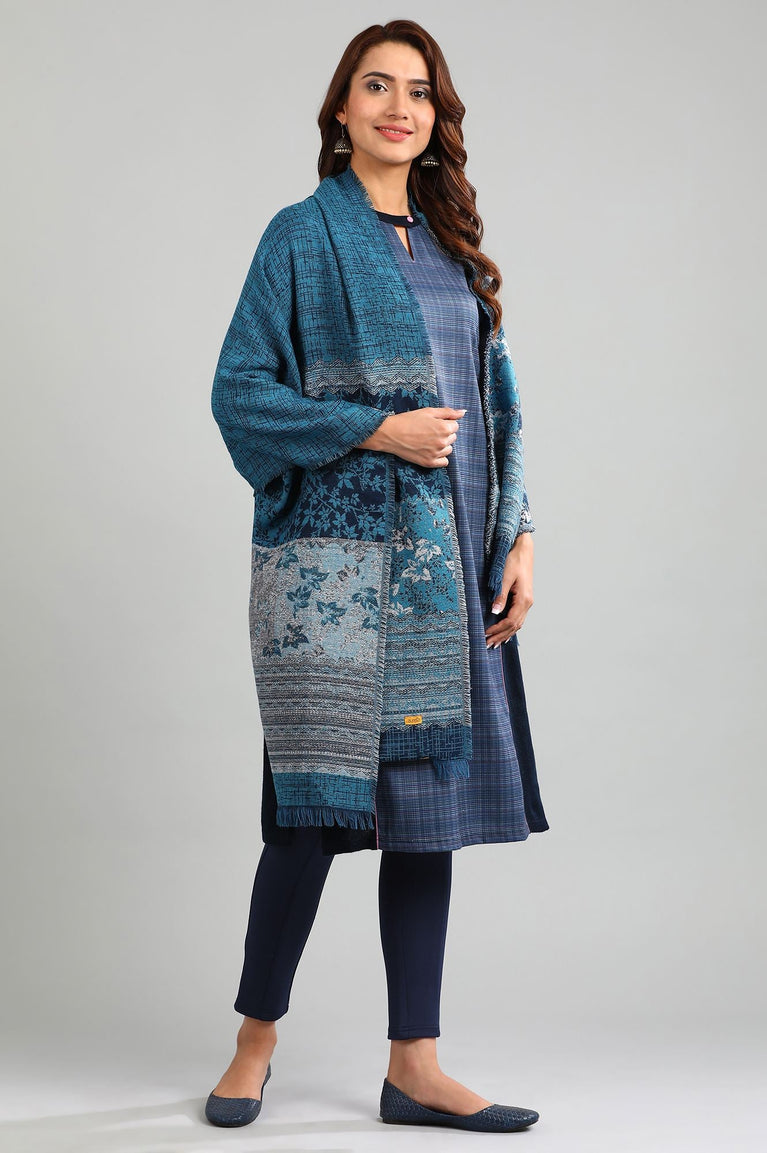 Blue round neck 3/4 sleeve kurta with printed detail.
