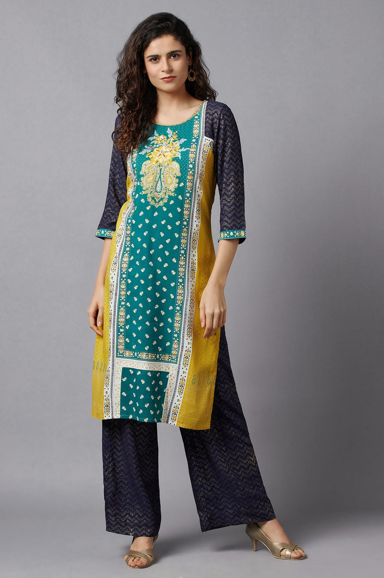 Revamp your casual ethnic wear wardrobe by adding these modern set. The set includes a blue straight fit kurta having thread embroidery on yoke and orange printed straight palazzo pants.
