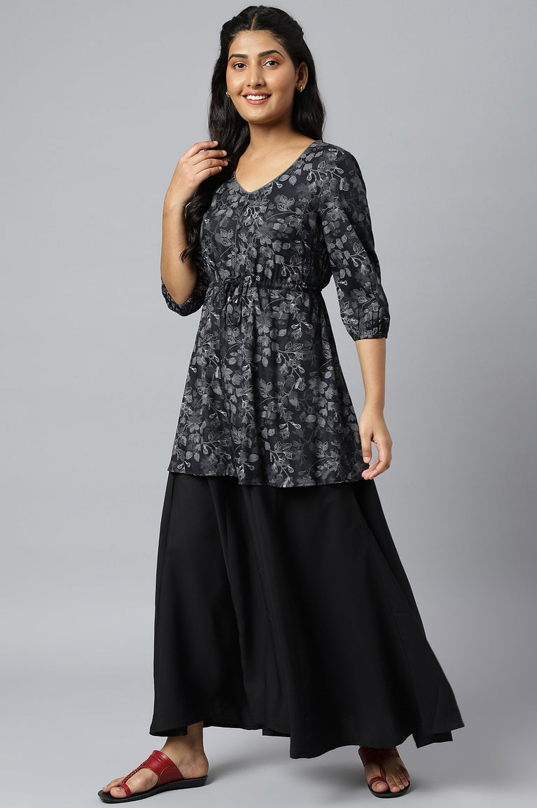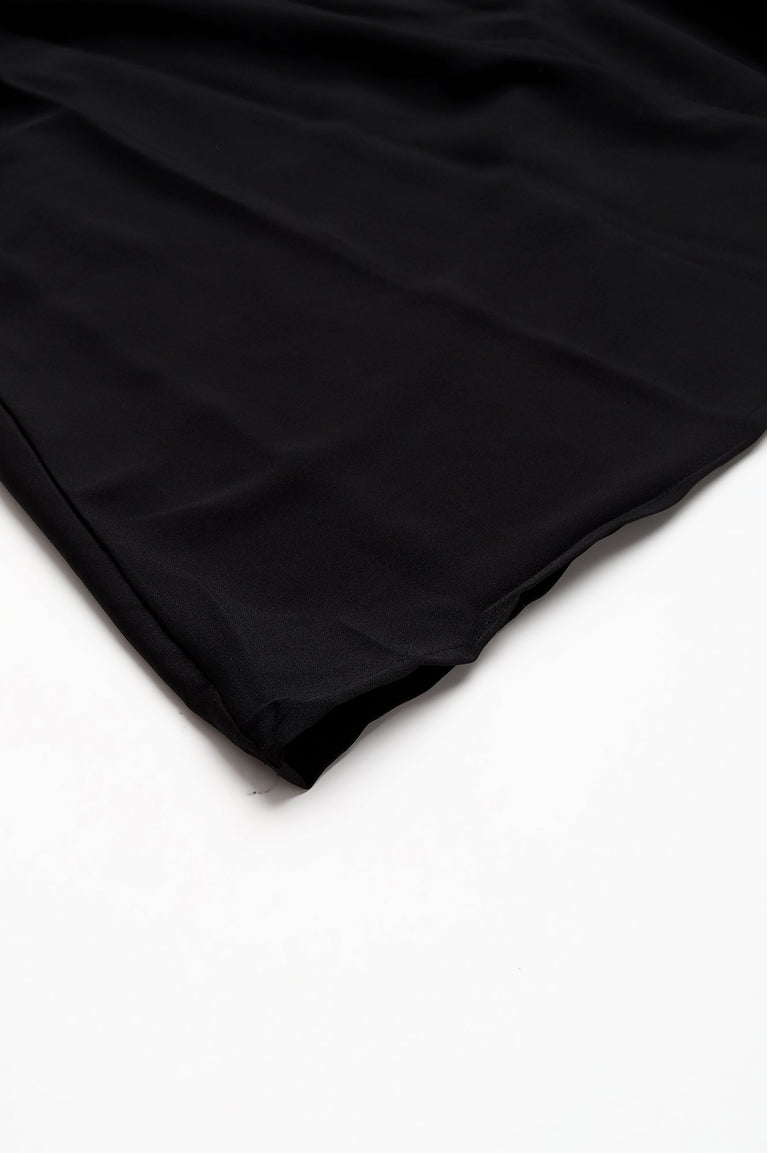 Effortlessly chic and versatile, this black solid flared palazzo is a wardrobe essential. Crafted from a premium woven rayon blend, it features a flattering slip-on closure and a pleated design that adds a touch of sophistication. The elasticized back waistband ensures a comfortable fit, while the side slash pockets offer practicality without compromising style. Perfect for casual outings or festive occasions, this palazzo pairs beautifully with crop tops, blouses, or kurtas. Add statement jewelry and heels to complete your look with grace and elegance.