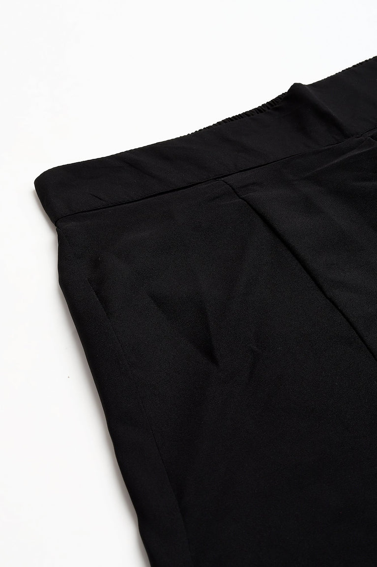 Effortlessly chic and comfortable, these black solid trousers are crafted from 100% cotton for a breathable and soft feel. Featuring a mid-rise design and a partially elasticated waistband, they offer a flattering fit and ease of wear. The straight hem and ankle-length silhouette add a modern touch, while the two front pockets provide practicality. Perfect for casual outings, pair these versatile trousers with a kurta and flats for a relaxed yet stylish look.