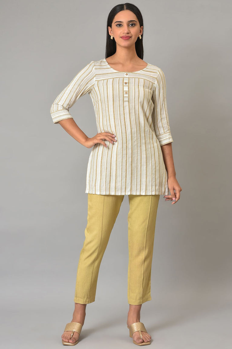 Beige casual trouser in ankle length having mid-rise and partially elasticated waistband. This solid trouser has 2 front pockets and will be your top pick for a chic and comfy look.