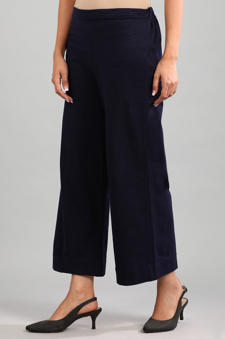 Blue yarn-dyed winter palazzos with elasticated back.