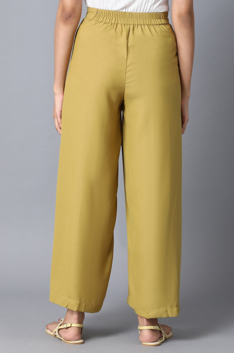 Teal green loose fit palazzo pants in mid-rise with partially elasticated waistband. The flat front and comfortable fit of the palazzo give you all-day long comfort.