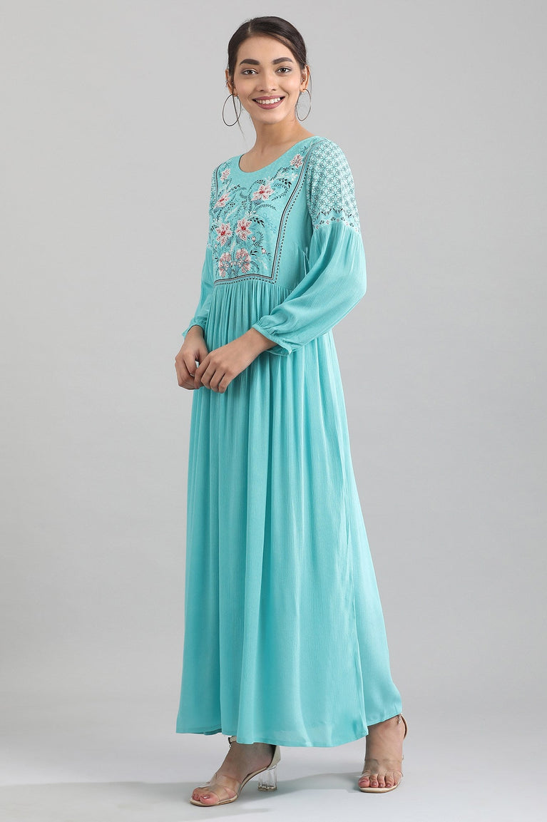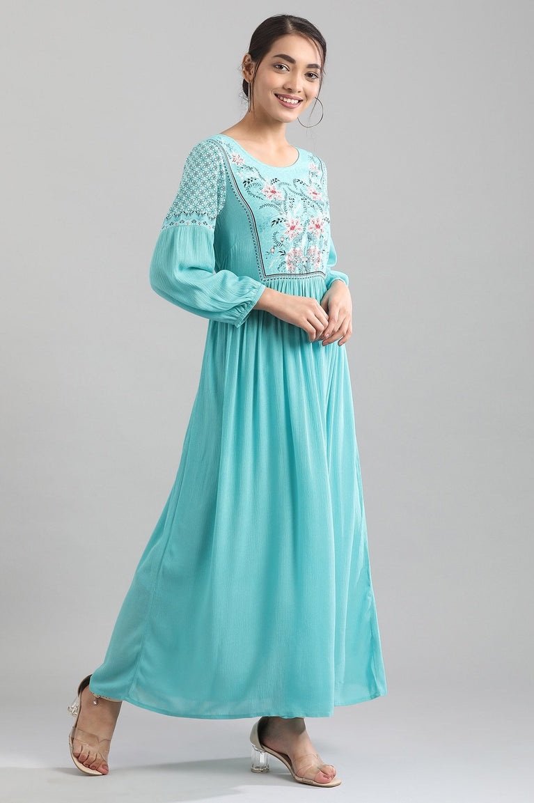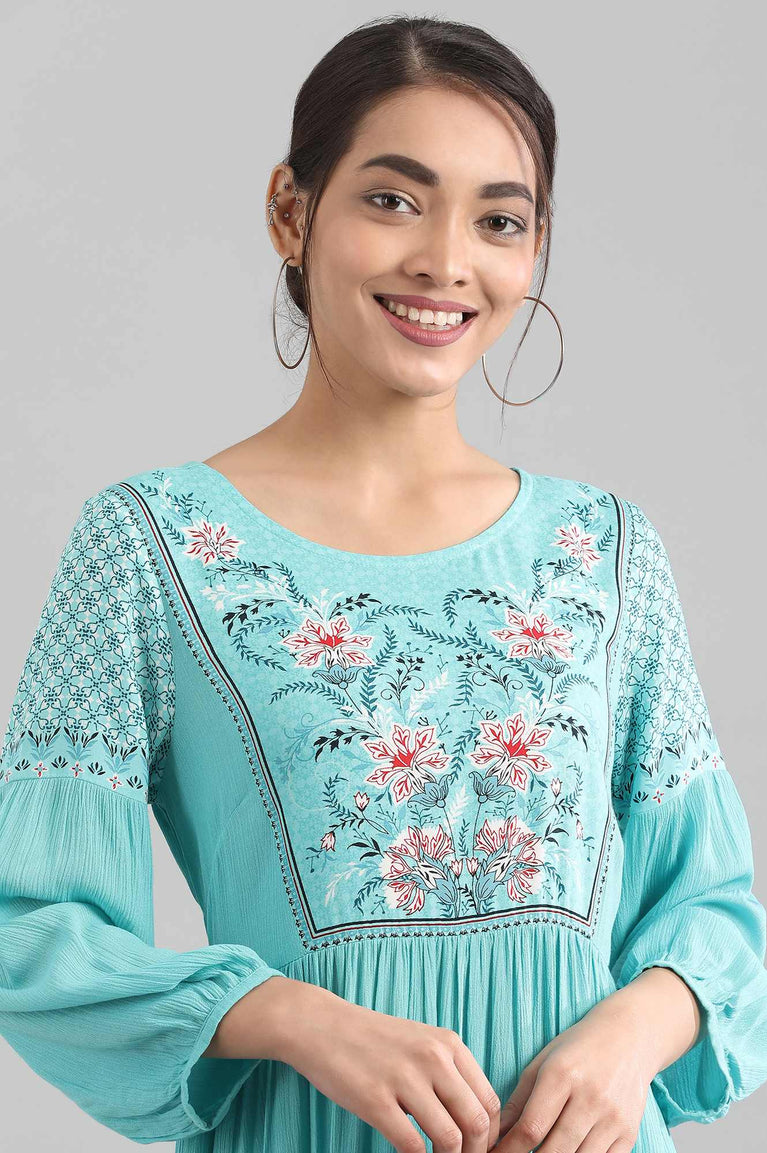 Blue Round Neck Printed Liva Dress