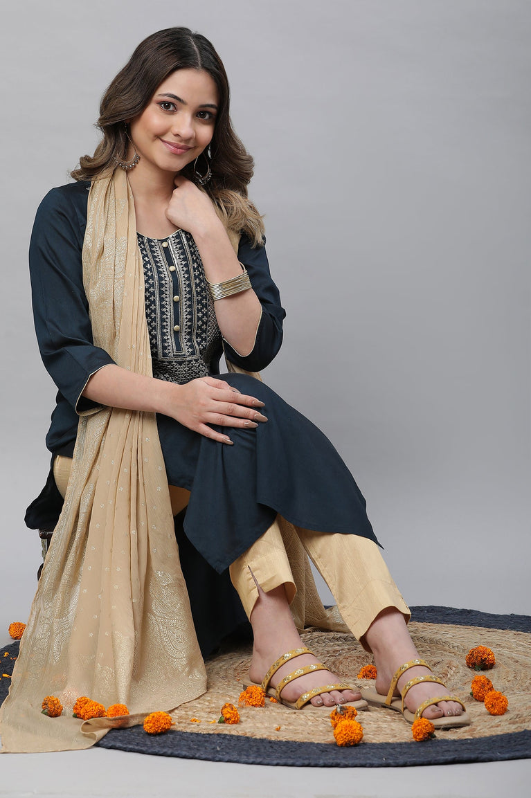Blue Embroidered kurta-Trousers-Blue Dupatta Set