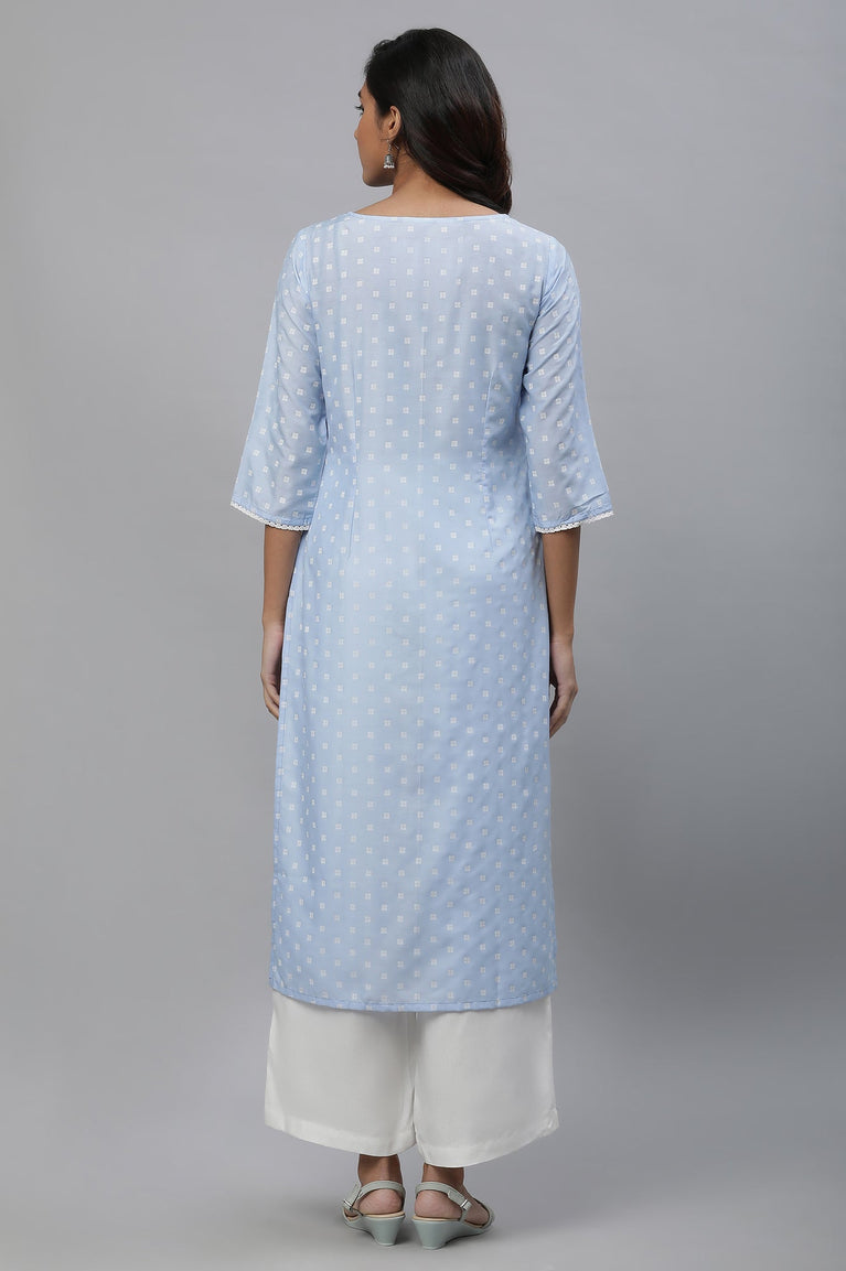 This blue V- neck 3/4 sleeve kurta has side slits.