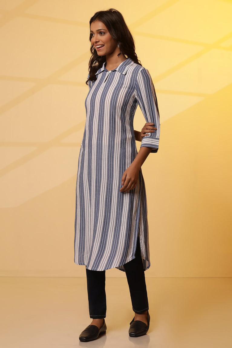 Blue and White Stripe Yarn-Dyed Casual Kurta