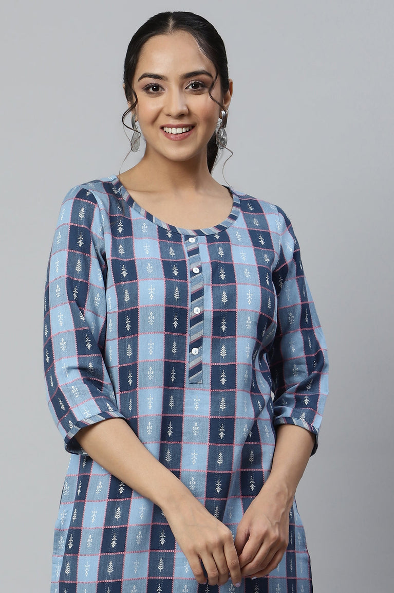 Blue Gingham Check Sleeveless Kurta and Straight Trousers Set