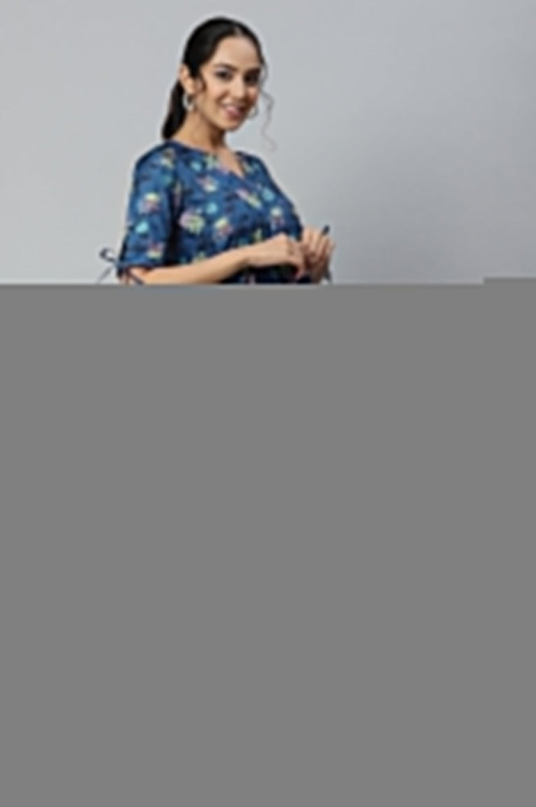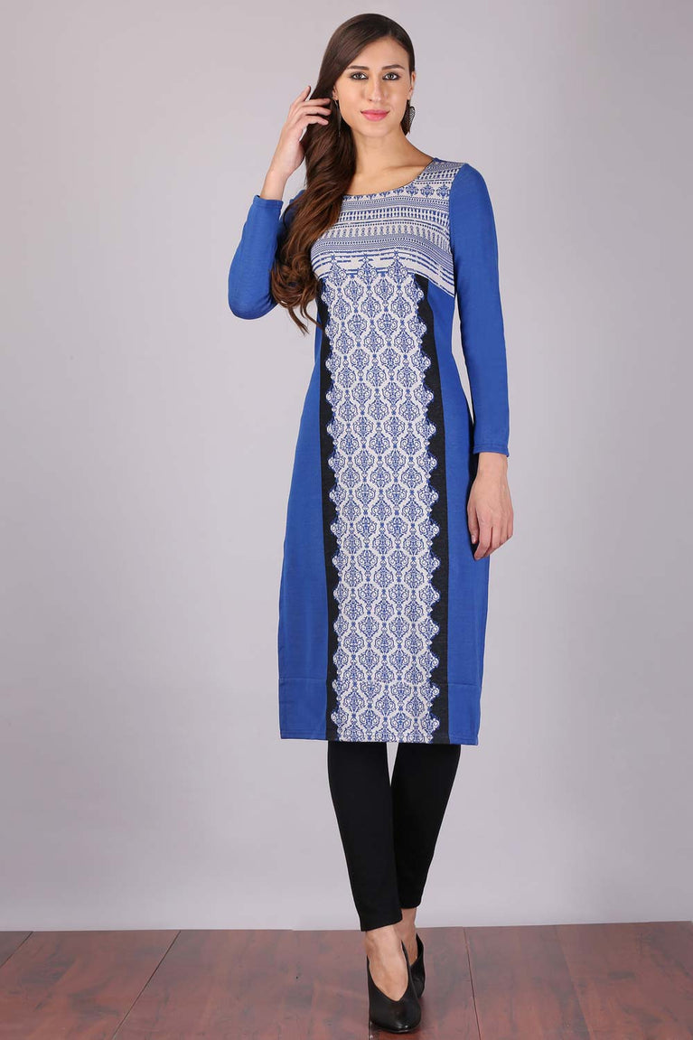 This blue round neck 3/4 sleeve ankle-length kurta has printed detail, flared hem and border detail around neck and hem.