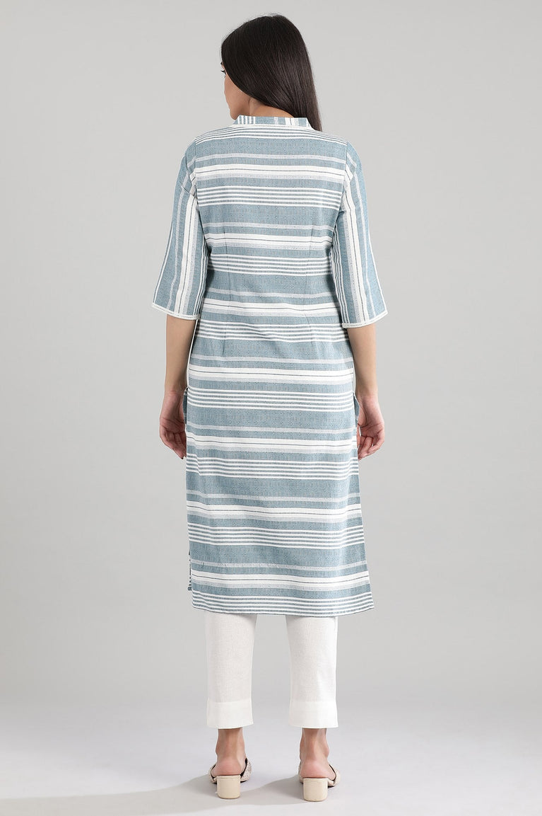 Be dressed la mode this festive season. Perfect for all occasions, this kurta set contains a blue all-over striped foil print kurta well-matched with solid palazzos.
