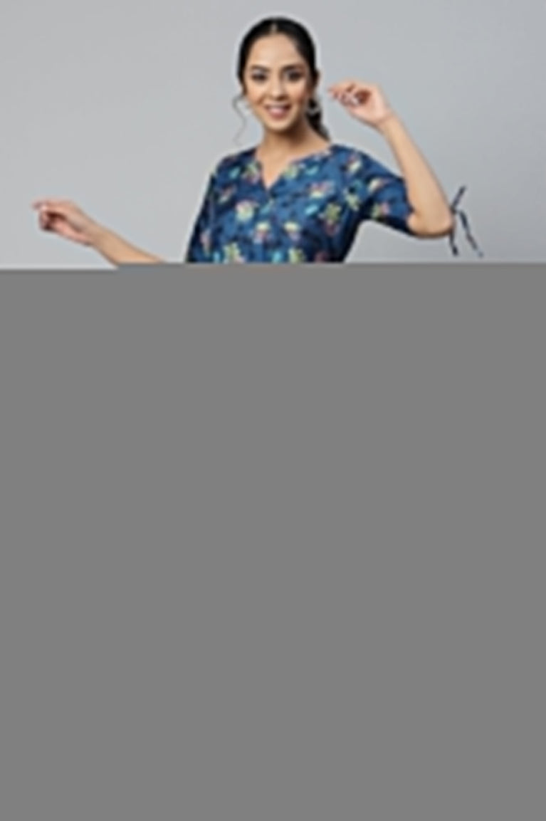 Blue Printed kurta In Mandarin Collar With Button Placket And Three-Quarter Sleeves. Paired With White Solid Palazzo In Mid-Rise And Elasticated Waistband.