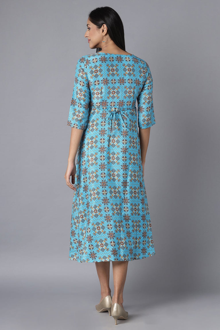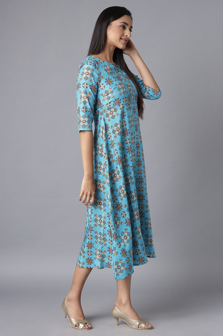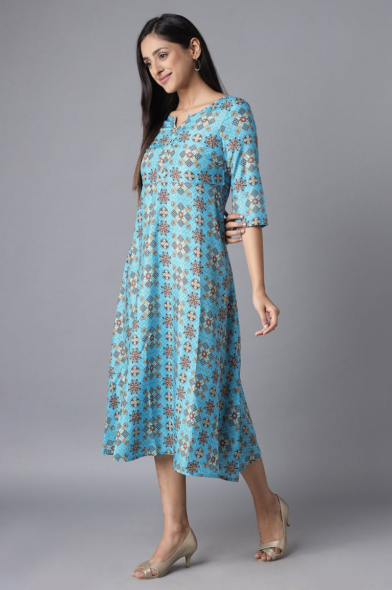 Pagoda blue printed kurta in round neck and three-quarter sleeves.