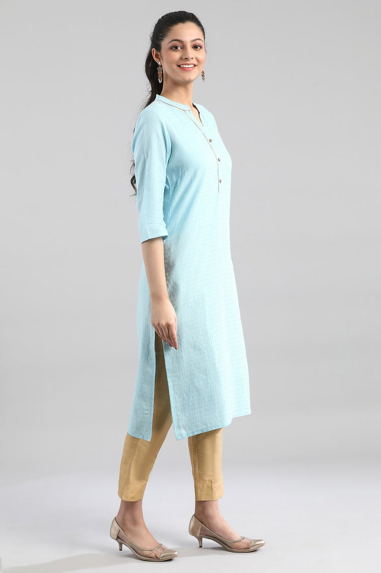 Blue round neck straight yarn-dyed Liva kurta with geometric pattern detail.