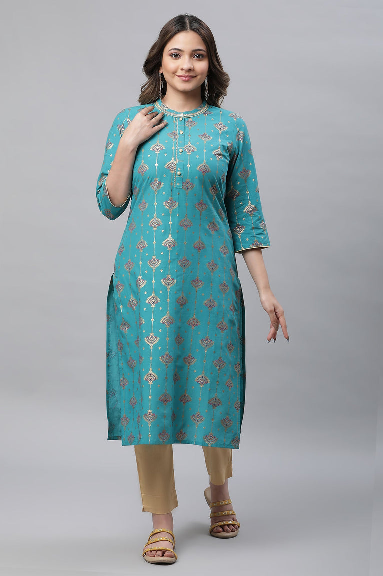 This blue boat neck 3/4 sleeve kurta has side slits.