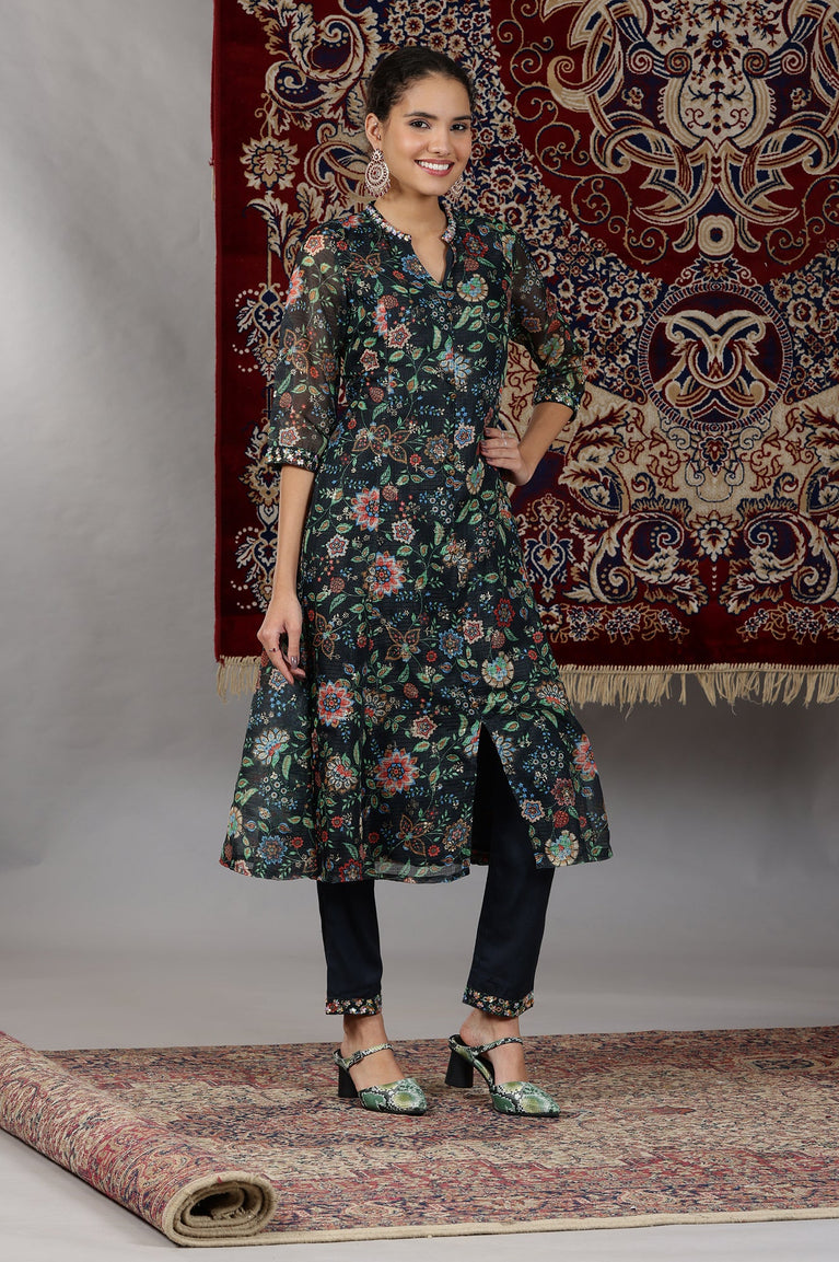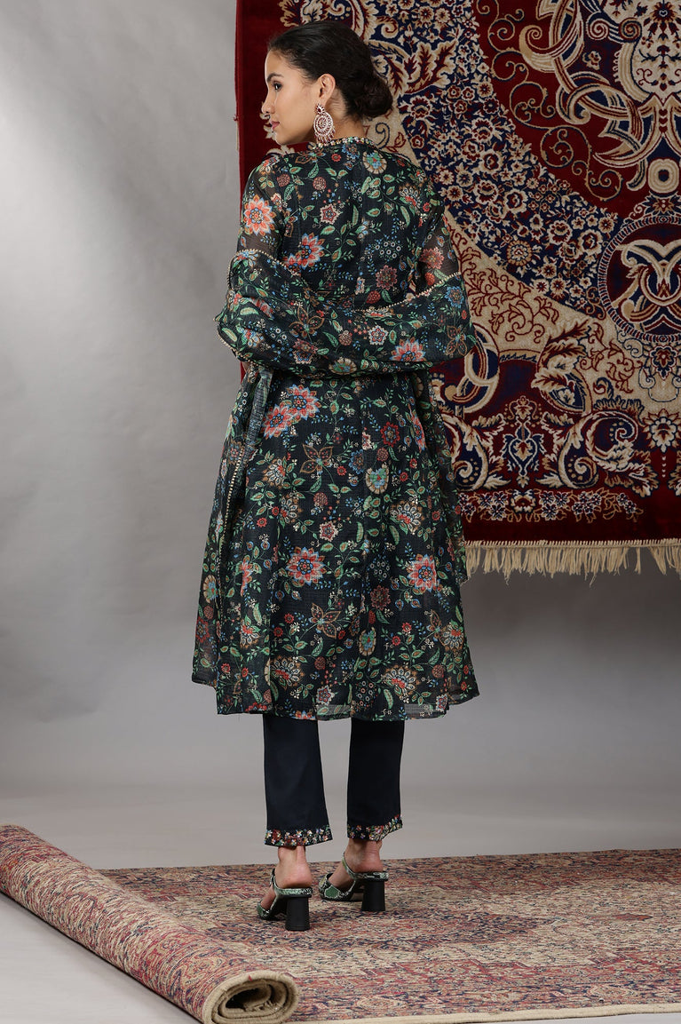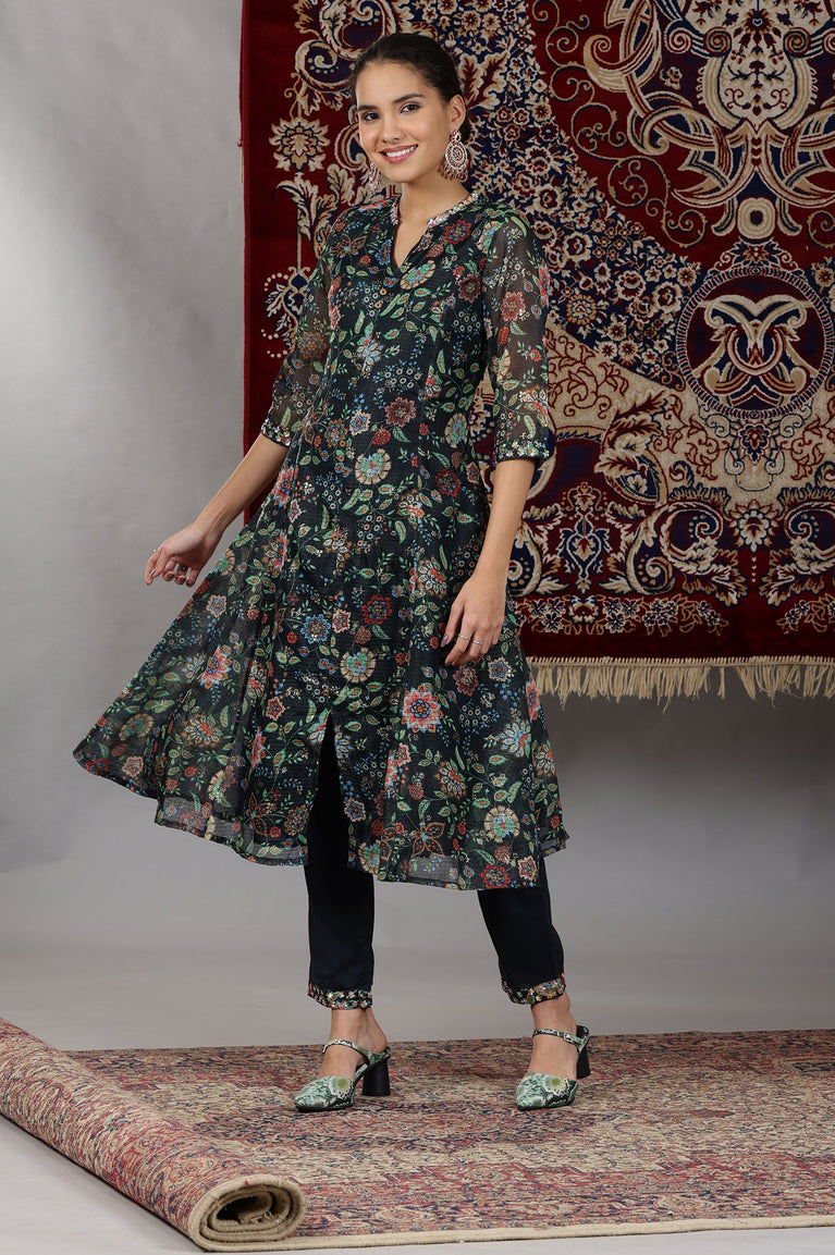 Black Floral Printed Kota Panelled Kurta, Pants and Dupatta Set