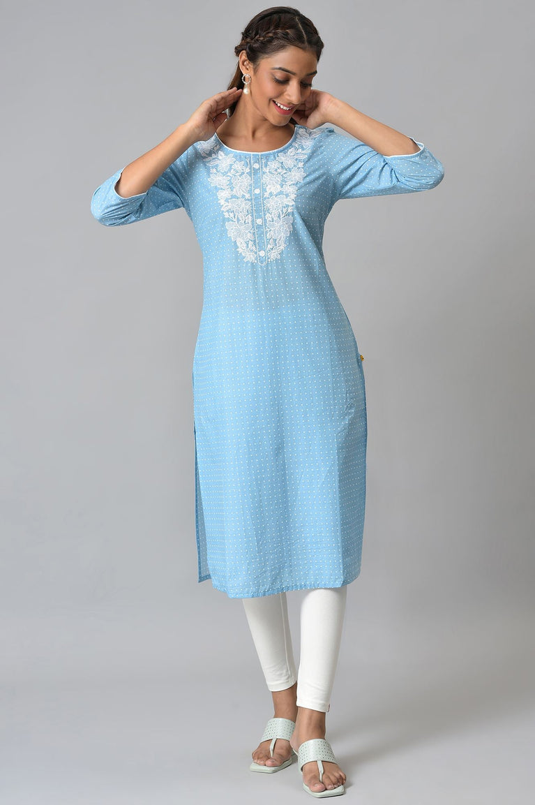 Blue geometric print straight kurta in round neck and 3/4th sleeves