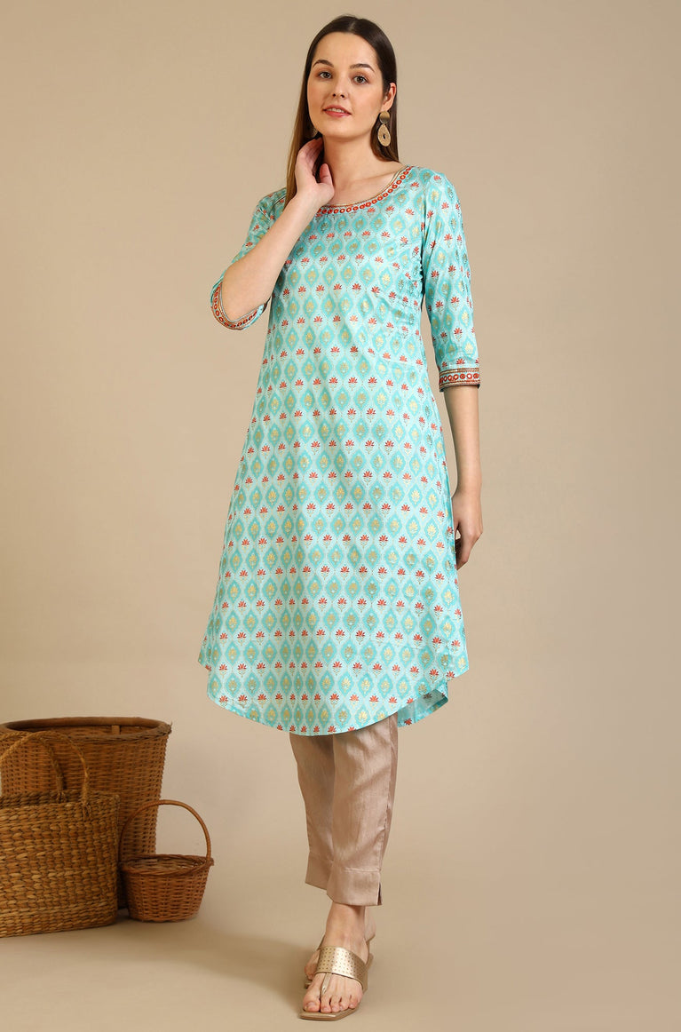 Discover effortless elegance with this Aurelia aqua-colored kurta, perfect for casual occasions. Crafted using a woven construction technique, this fusion-style piece features a sophisticated band neckline and practical three-quarter sleeves. The below-knee length and straight silhouette create a flattering profile, while the slit detail adds a touch of modern flair. Made from a luxurious blend of 60% modal fabric, this kurta offers both comfort and style. The versatile design makes it an ideal choice for women looking to elevate their everyday wardrobe with a hint of ethnic charm. The viscose composition ensures breathability and a soft feel against the skin, making it suitable for all-day wear. Whether paired with leggings or palazzo pants, this Aurelia kurta is sure to become a staple in your casual wear collection.