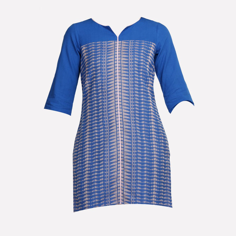 Elevate your style with our A-Line curved hem kurta, featuring a flattering silhouette, a round neck with an elegant V-slit and tab detail. This versatile piece allows you to mix and match effortlessly with our true blue tights and a printed mulmul stole, providing a range of stylish and comfortable options for various occasions.