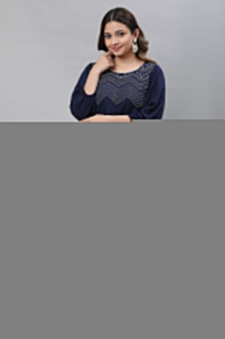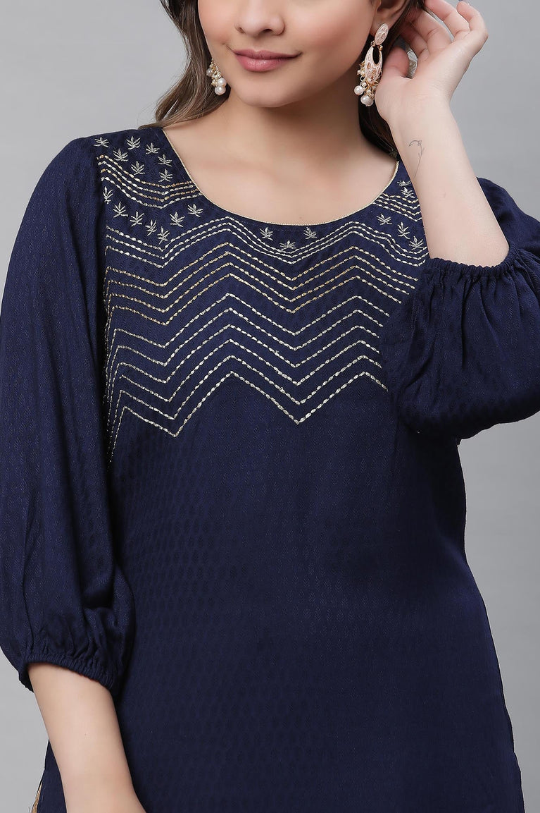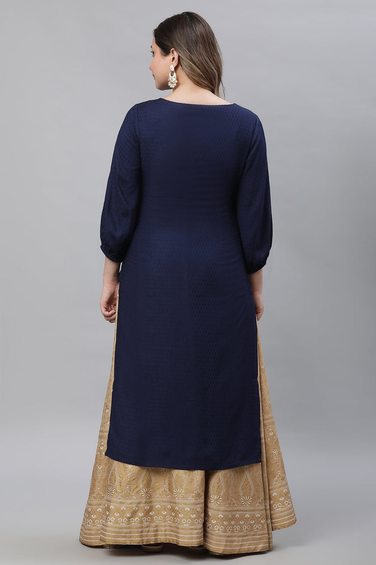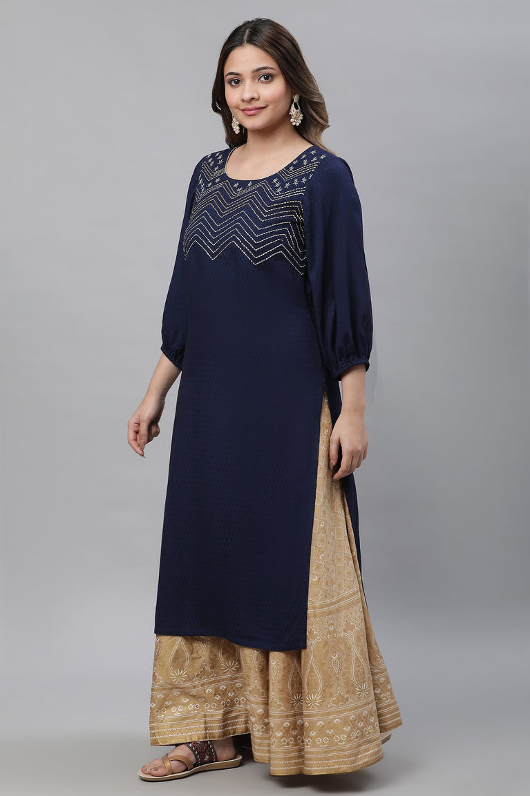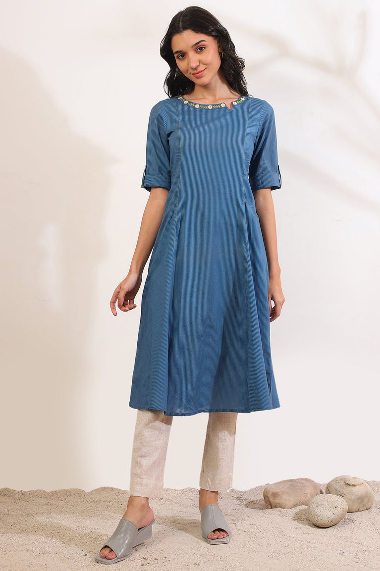 This blue round neck 3/4 sleeve kurta has flared hem.