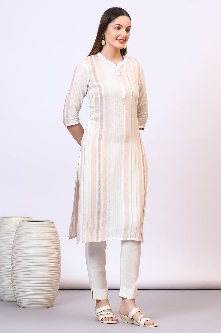 This refined yarn-dyed straight-cut kurta, crafted in luxurious rayon flax, is the epitome of understated elegance. Featuring a structured mandarin collar, it exudes a polished and sophisticated appeal, making it a versatile choice for both formal and semi-formal occasions. The crisp detailing and tailored silhouette offer a sleek and modern look, ensuring effortless style and comfort. Perfect for office wear, social gatherings, or evening outings, this kurta can be effortlessly paired with straight pants or trousers. Elevate the ensemble with classic footwear and minimal accessories for a timeless and distinguished appearance.