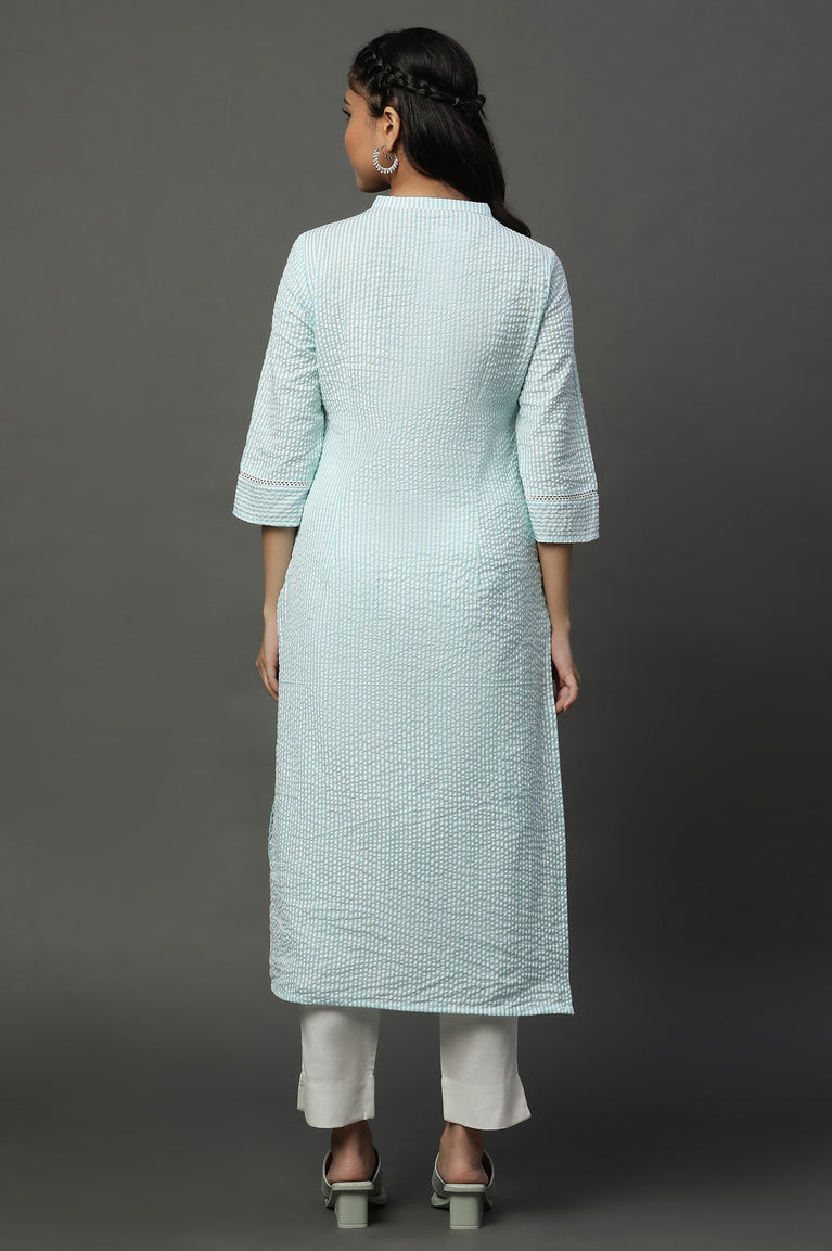 A straight kurta crafted from delicate seer sucker fabric in soothing blue and white hues, it gives a sense of elegance. The classic mandarin collar and a front placket adorned with tasteful buttons create an aura of sophistication. The element which truly sets this ensemble apart is, the intricate lace insert at the collar, sleeve and hem of the kurta. Every detail whispers a story of refined taste, making it the ideal choice for work or casual wear.