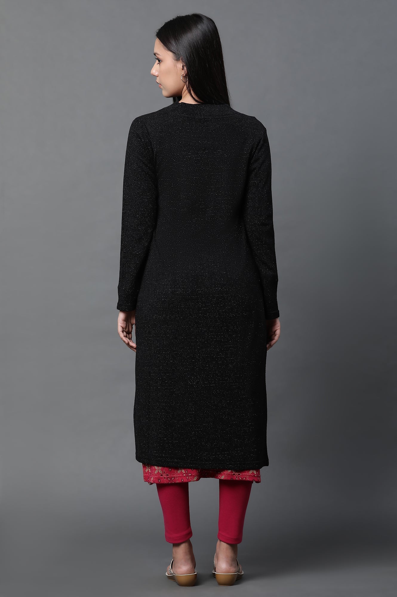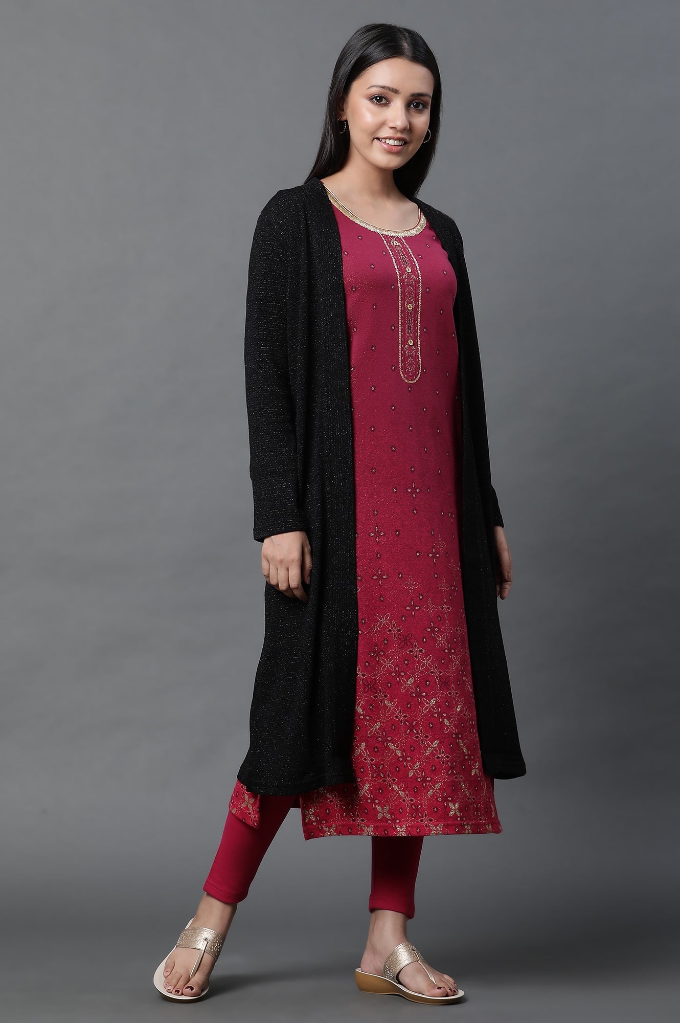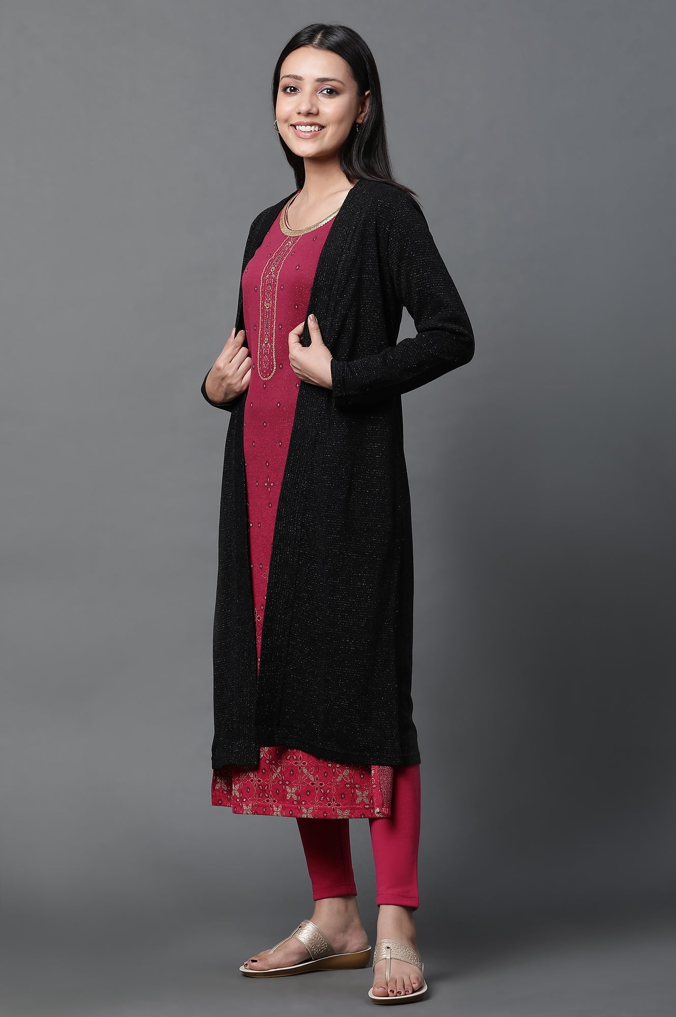 Here is the answer for "what to wear in slight winter breezy weather", A full sleeves gilet with lapel and long length to wear it over any of your kurta or top, which is front open that makes it versatile enough for your winter collection.