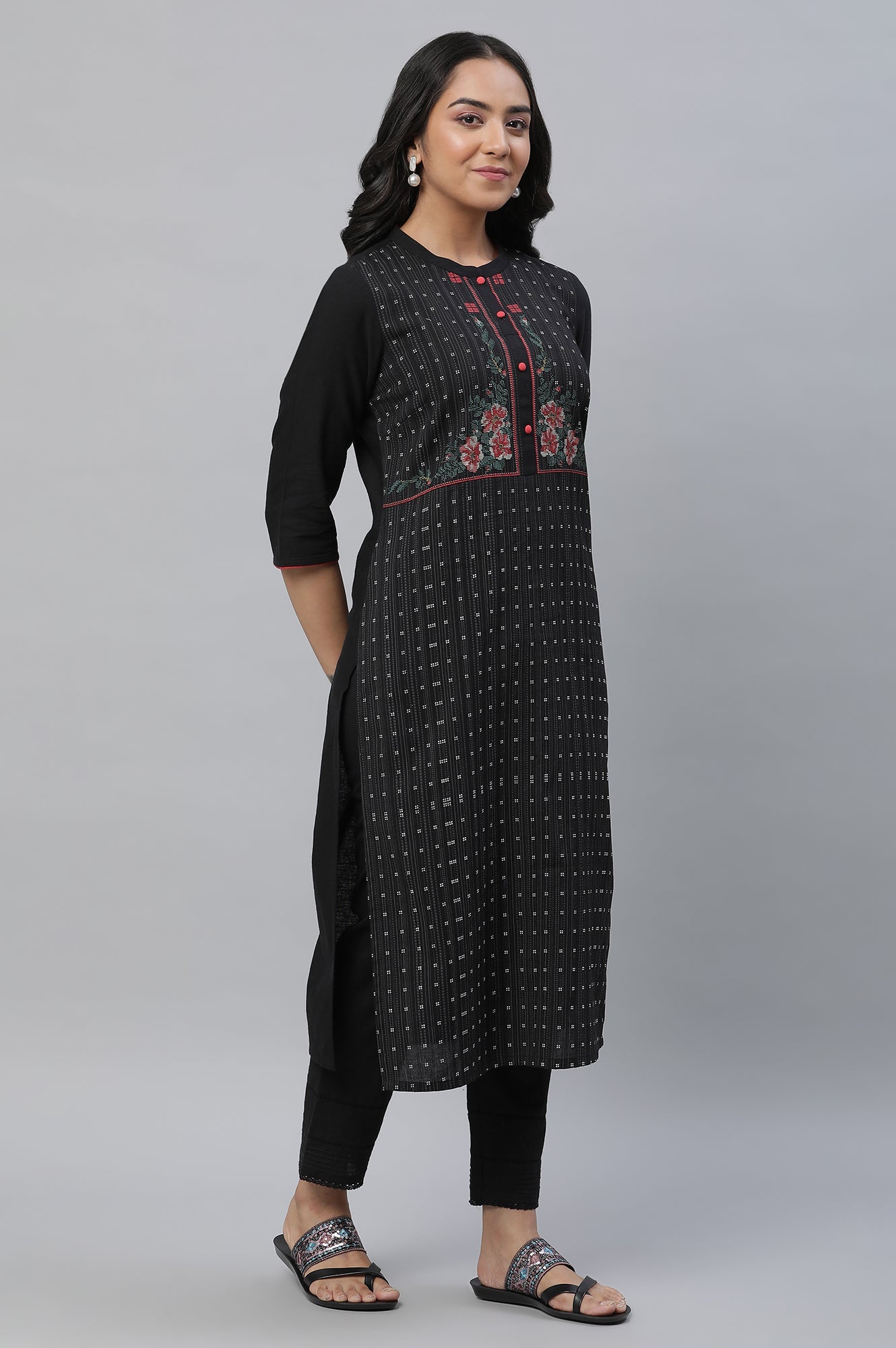 All time classic black coloured kurta, is everyones favourite for this season, it has contrast highlighted print and pop colored red buttons to elevate your overall look, perfect for any casual meet-ups or any ening-out.