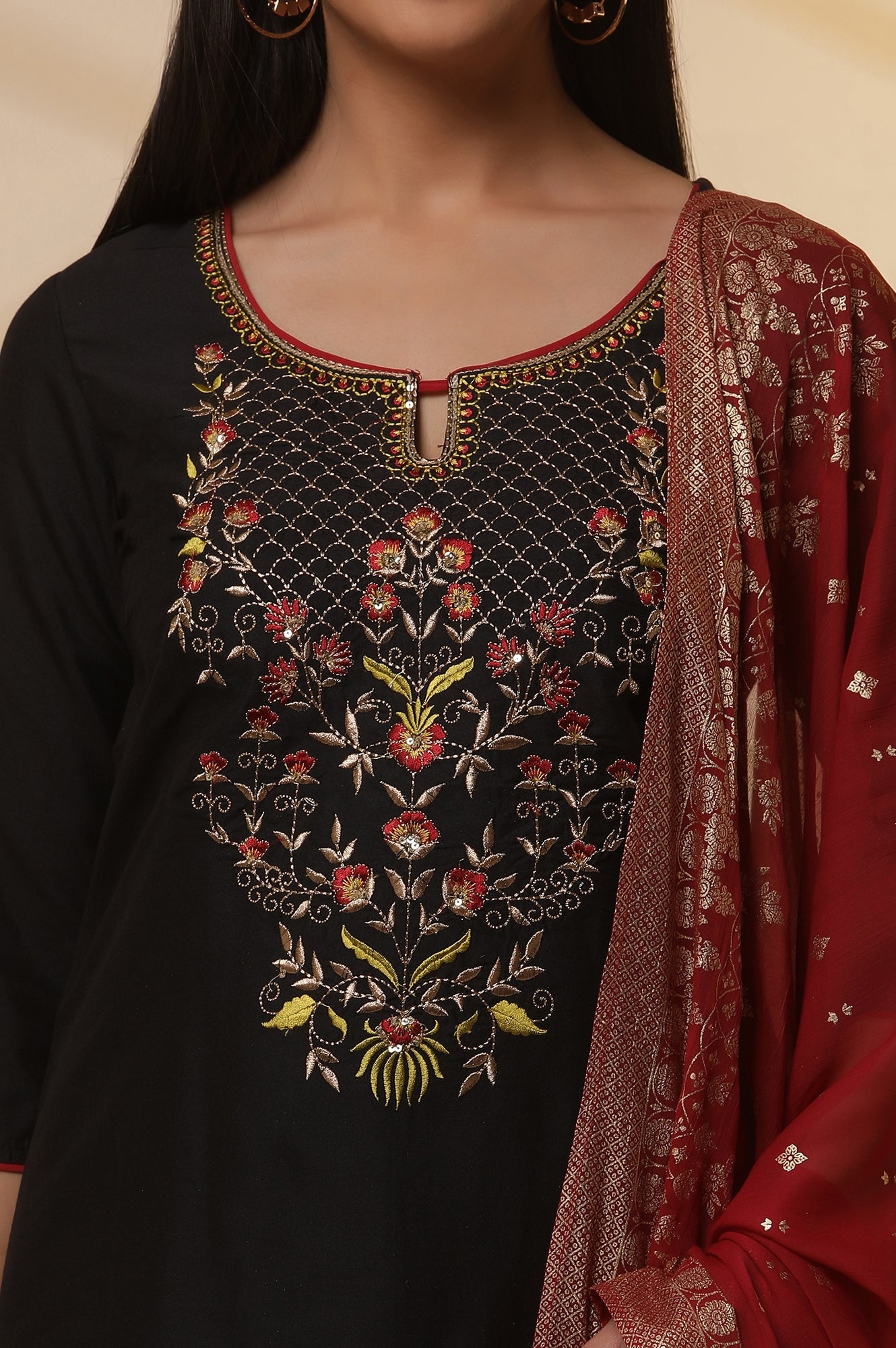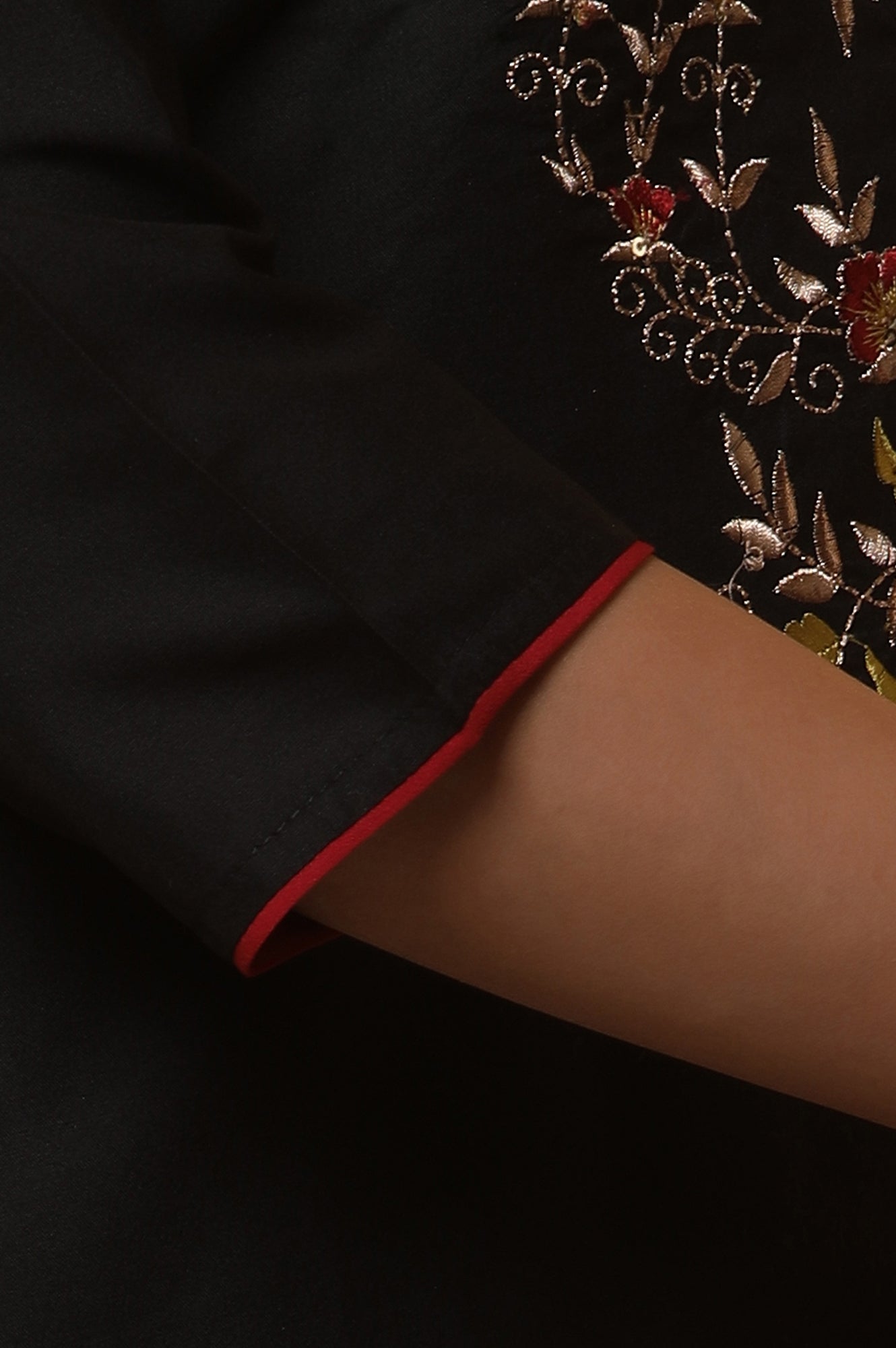 Embrace timeless elegance with our black zari embroidered straight kurta Set. The kurta, crafted in classic black, is adorned with intricate zari embroidery that adds a touch of opulence and refinement. It pairs beautifully with a vibrant red printed skirt, creating a striking contrast and a sophisticated silhouette. The ensemble is completed with a matching dupatta, enhancing the outfit with its delicate design and flowing elegance. Perfect for festive occasions or special events, this set combines rich textures and bold colors to create a look that is both graceful and impactful.