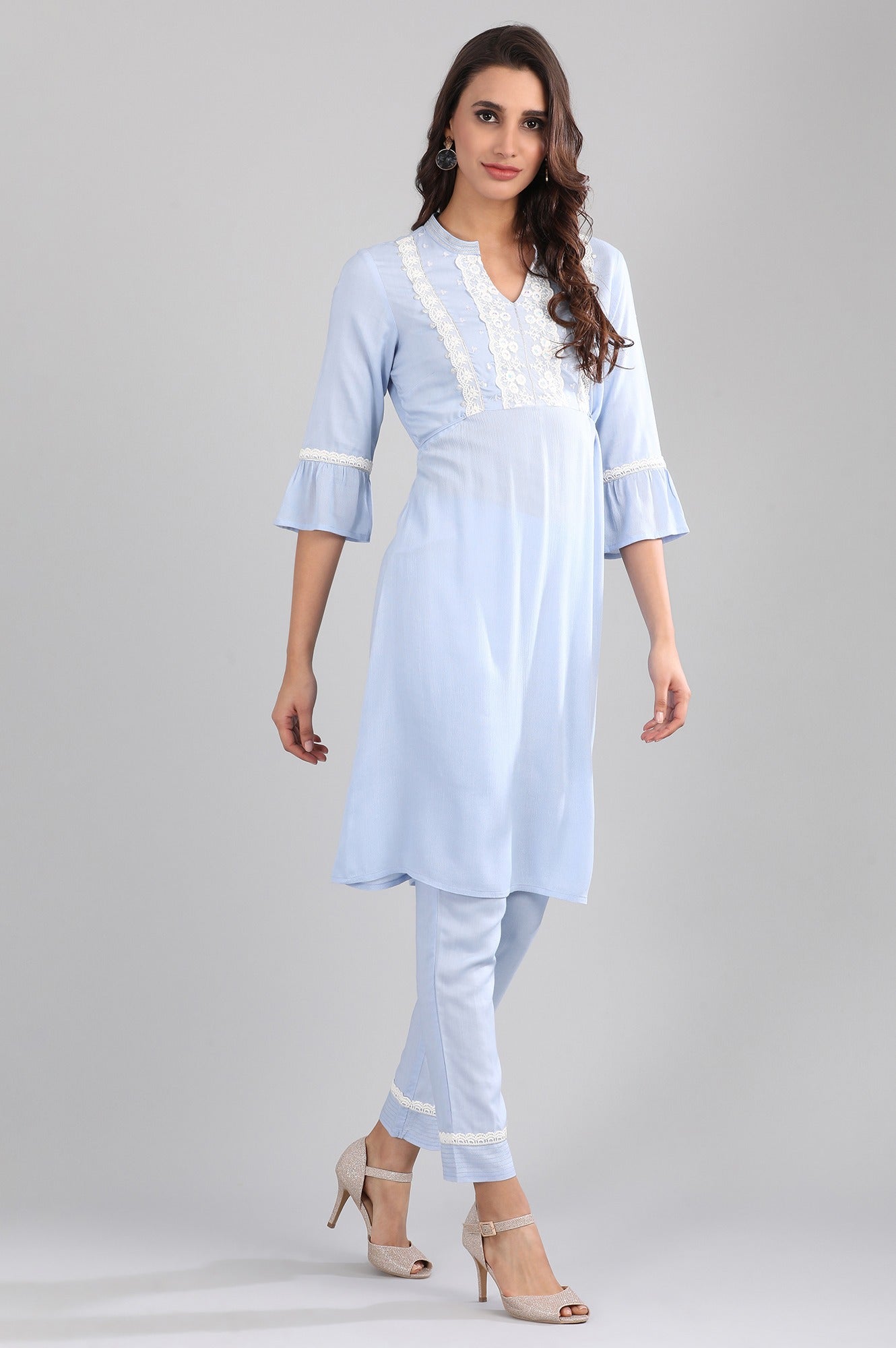 This kurta set has a blue kurta with lace yoke detail and matching trousers.