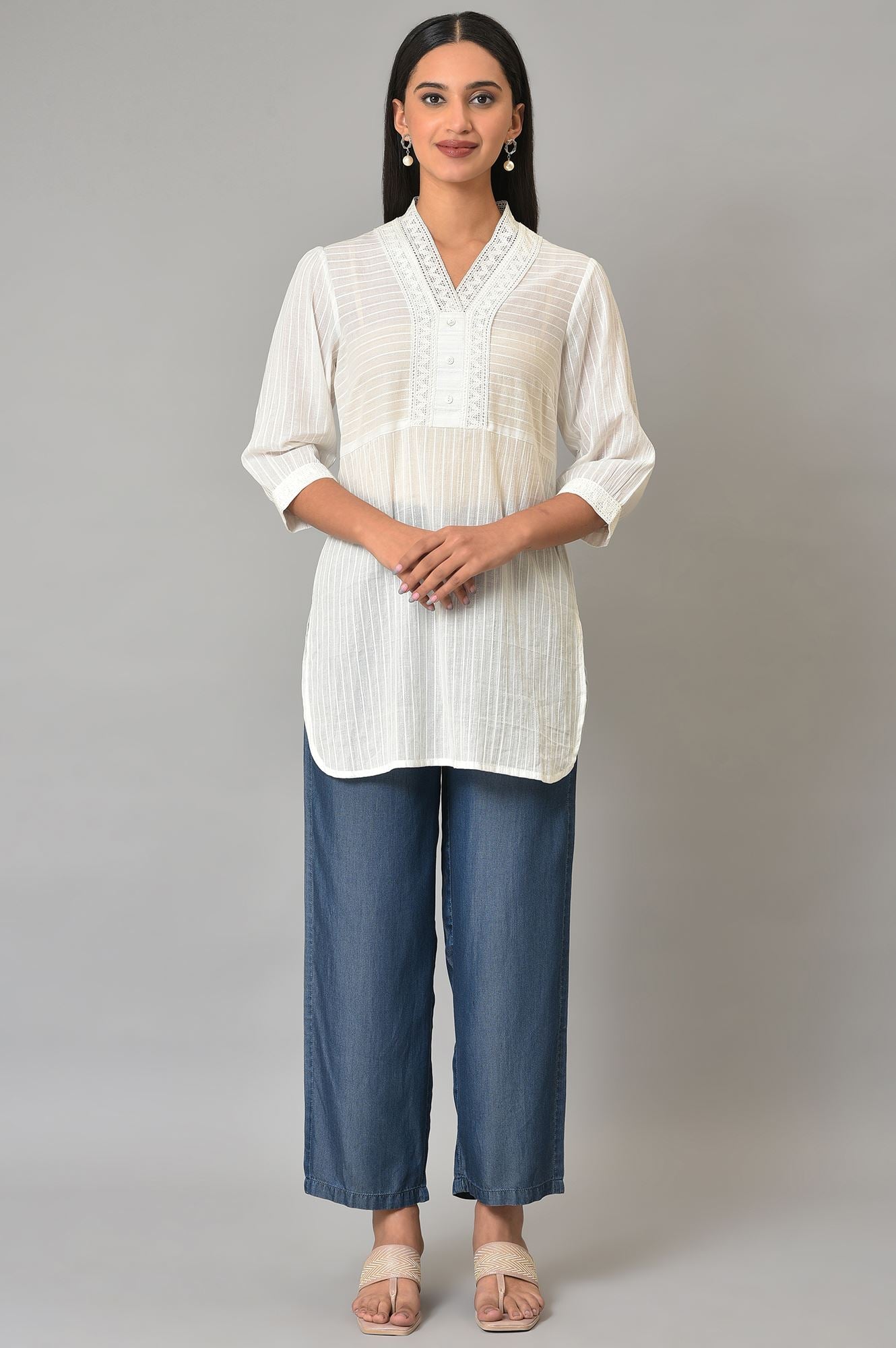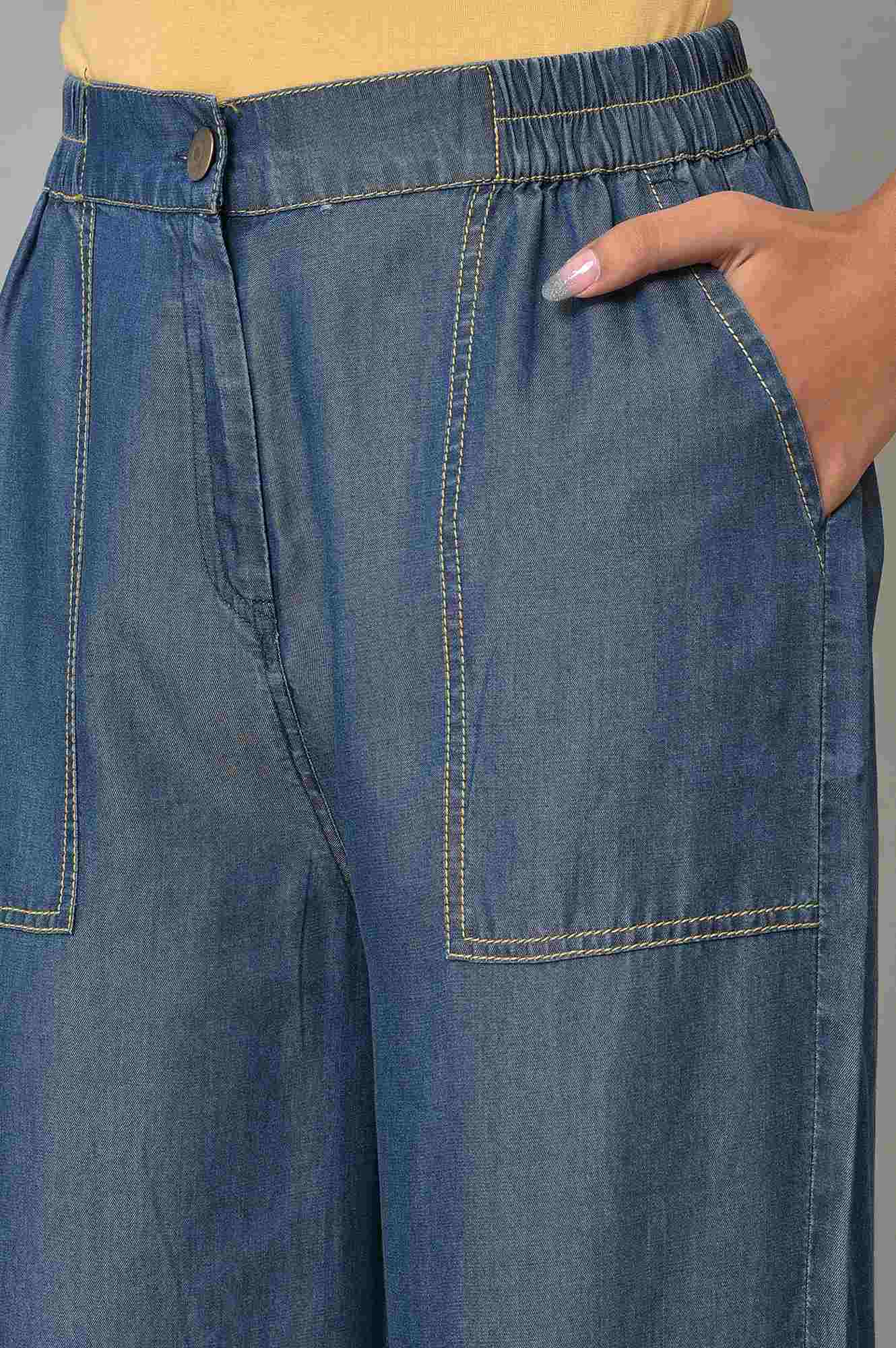 Denim Narrow Pants In Ankle Length Having Mid-Rise And Partially Elasticated Waistband. This Solid Trouser Has A Front Fly With Zipper And Button Closure Along With Front Patch Pockets For A Smart Look.